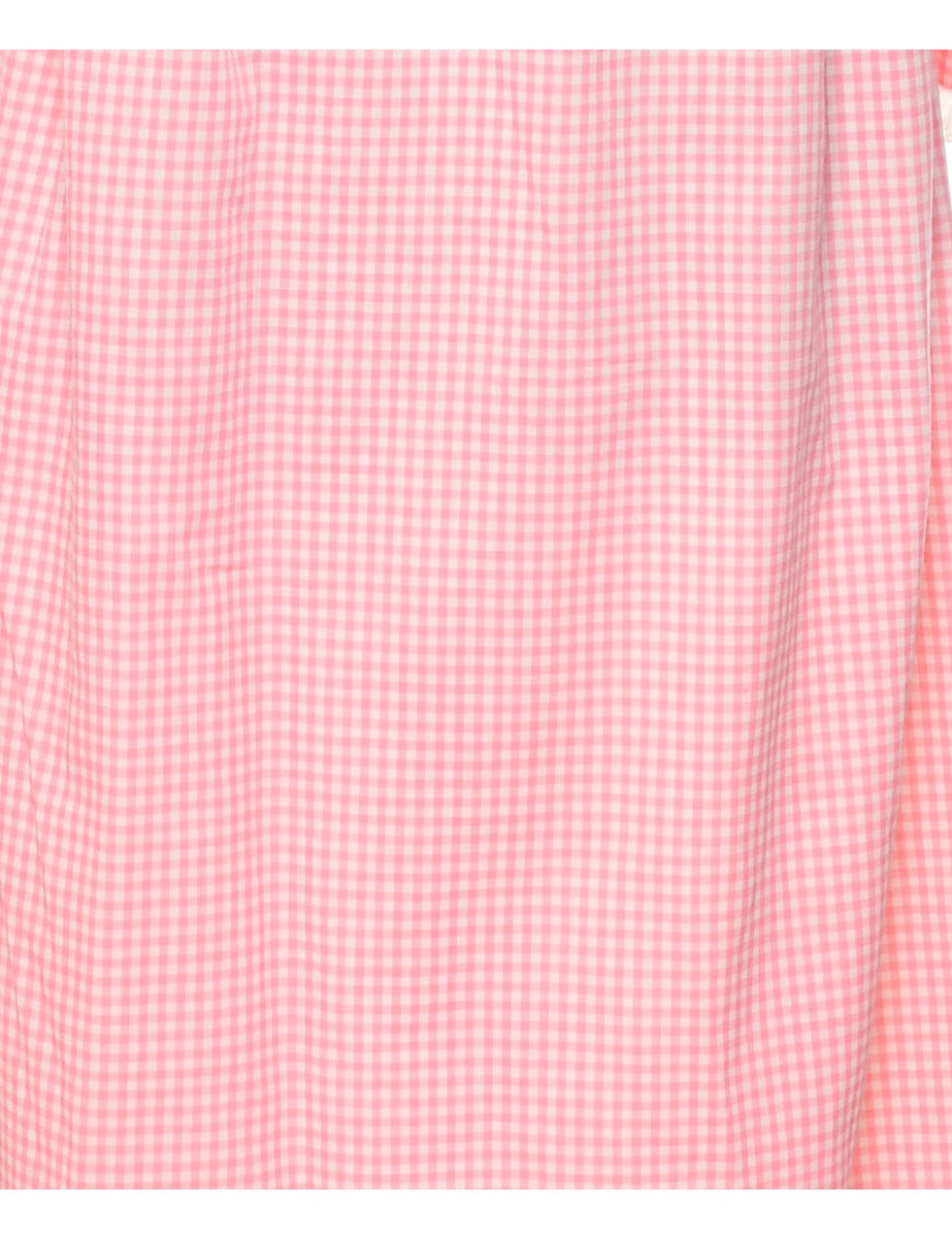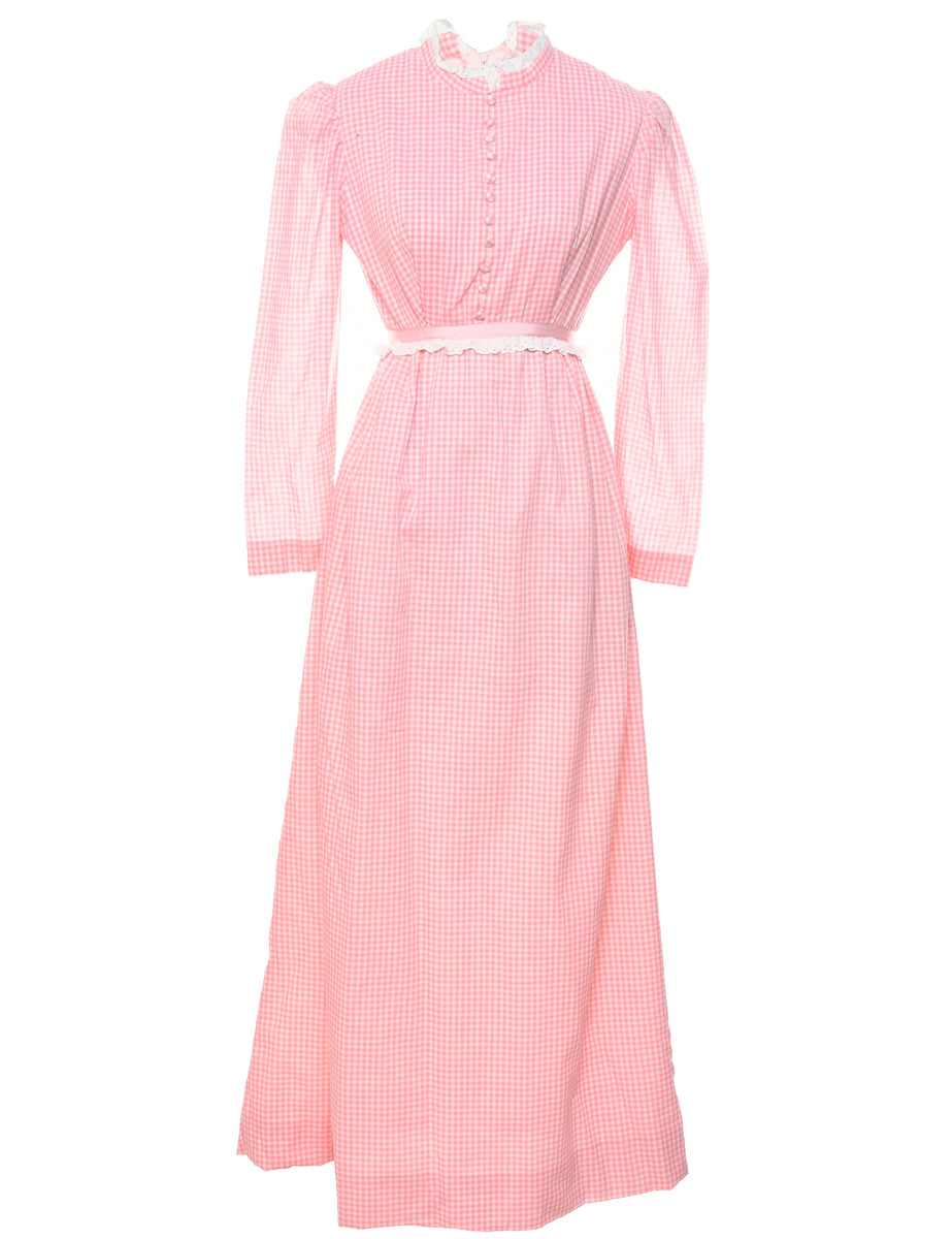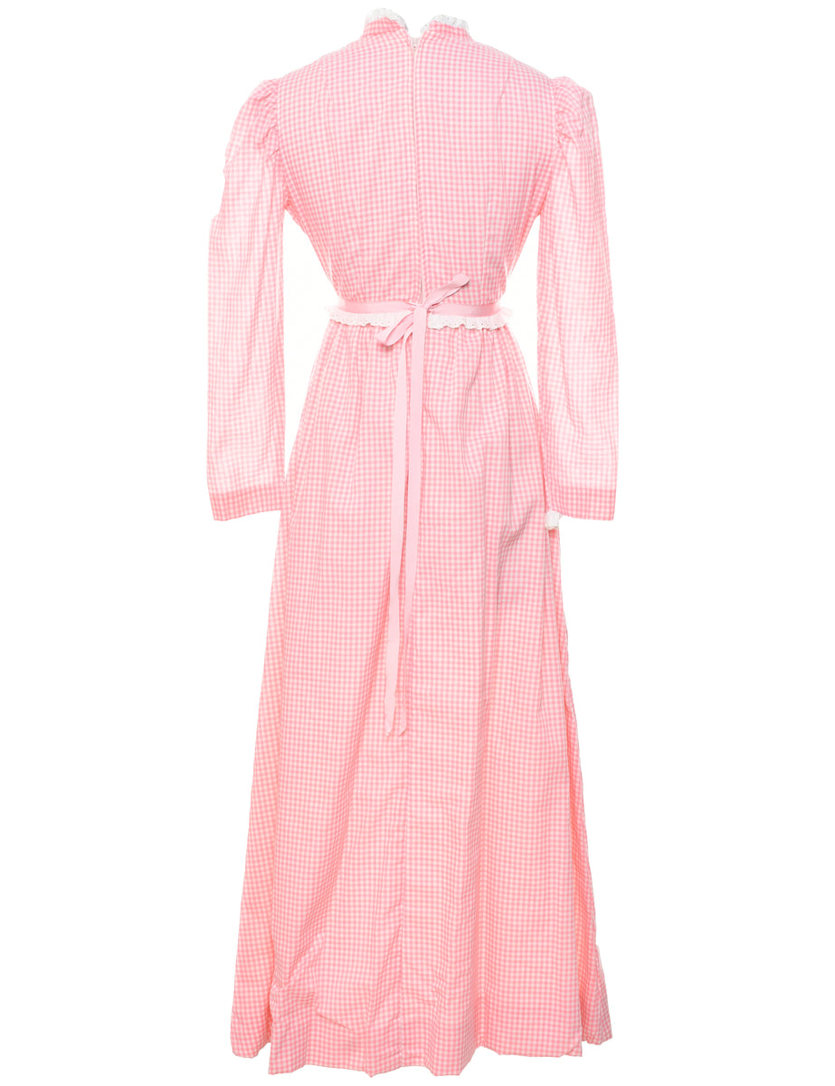 1970s gingham maxi dress. Comes in pink with a high neck and lace trim.