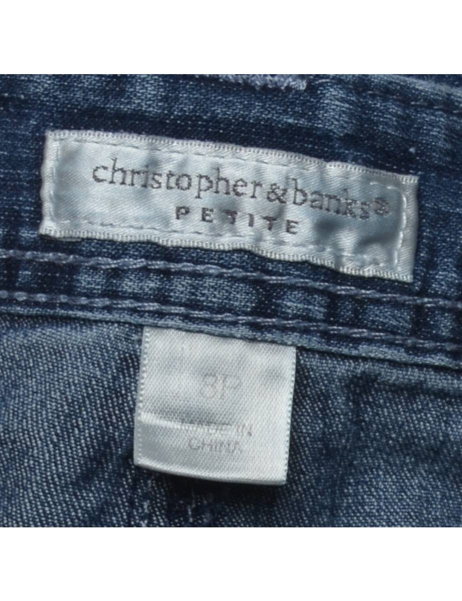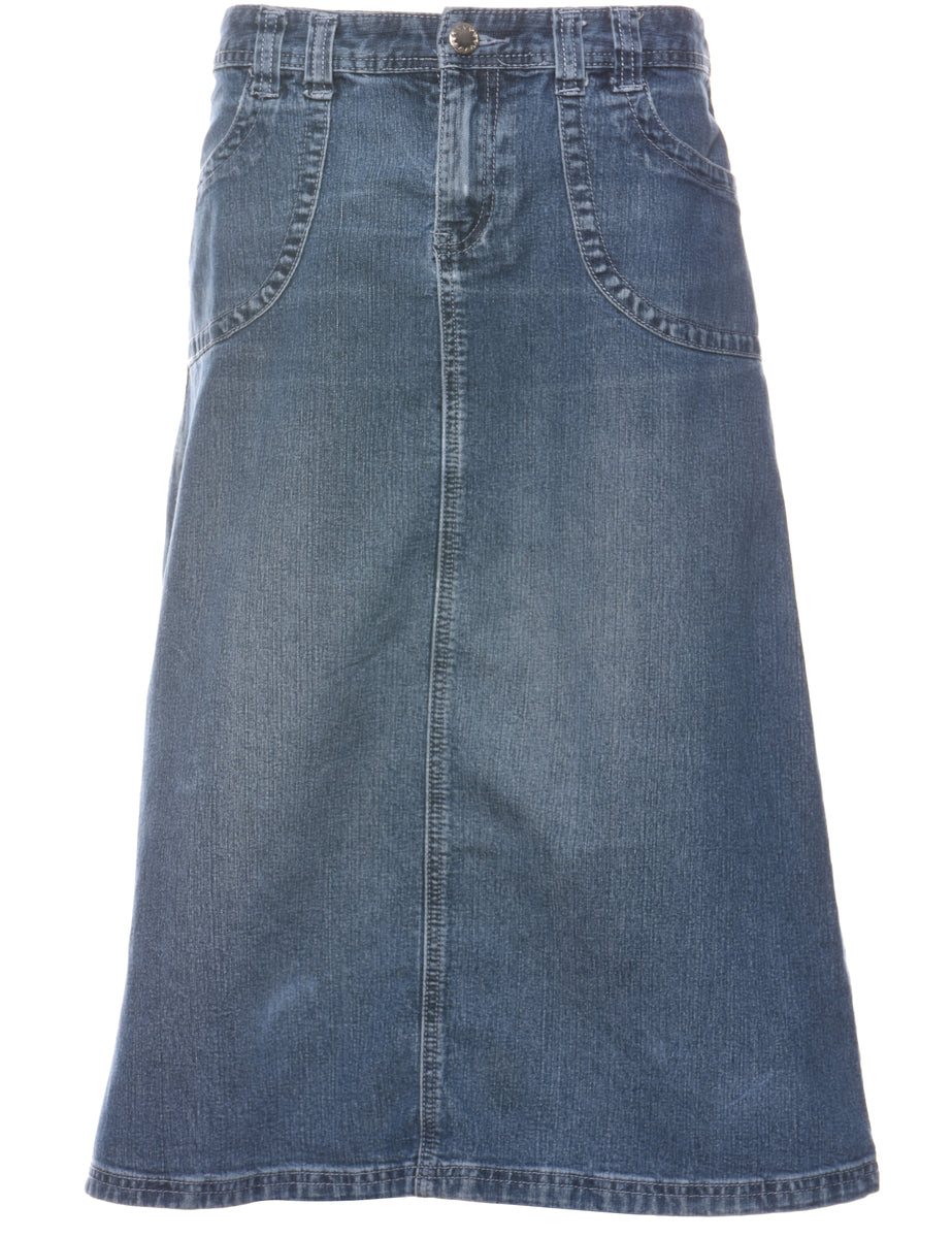 A-line denim skirt. Comes in medium wash with multiple pockets.