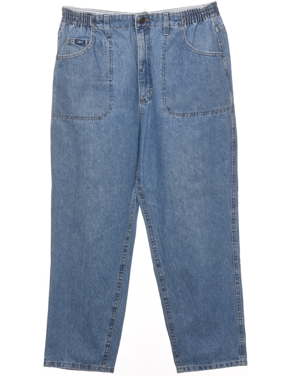 Lee tapered denim trousers in medium wash with multiple pockets.