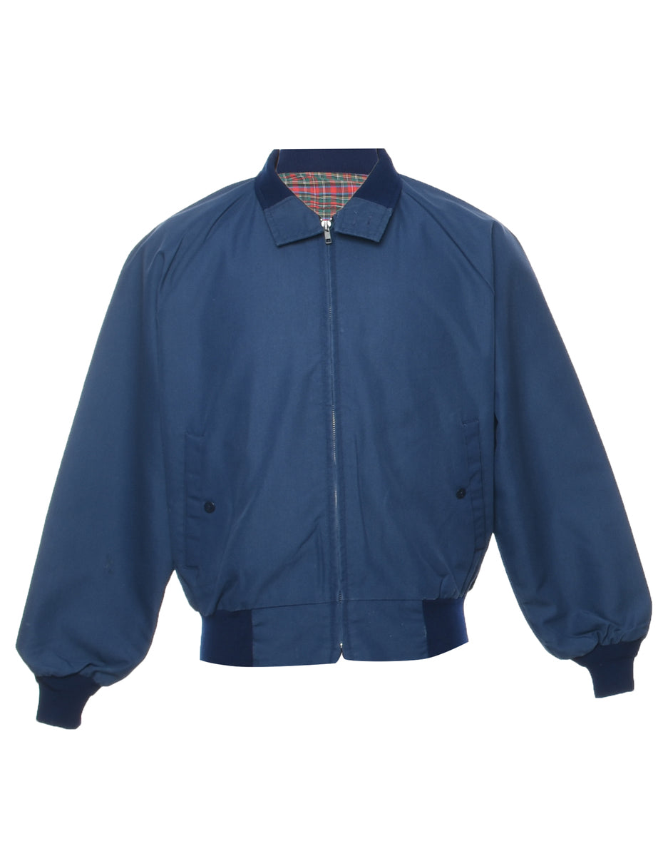 Zip front jacket comes in navy with multiple pockets and raglan sleeves.