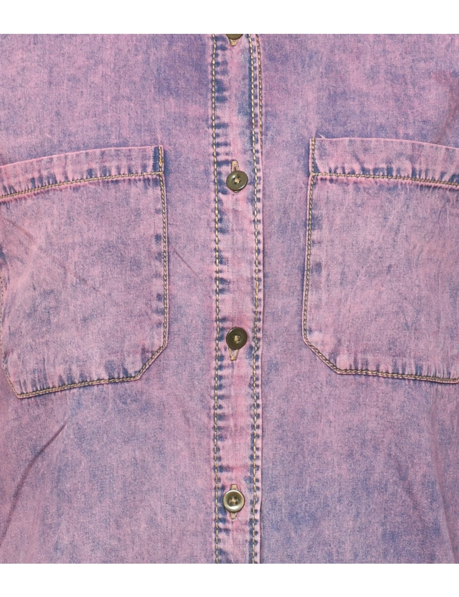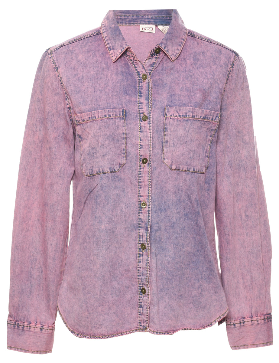 Long sleeved denim shirt in pale pink with a classic collar and multiple pocket.