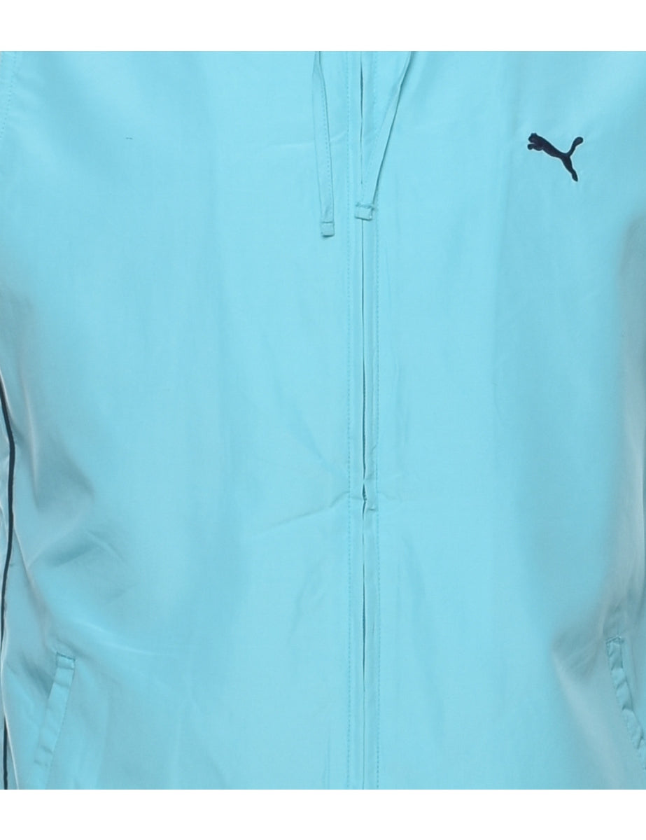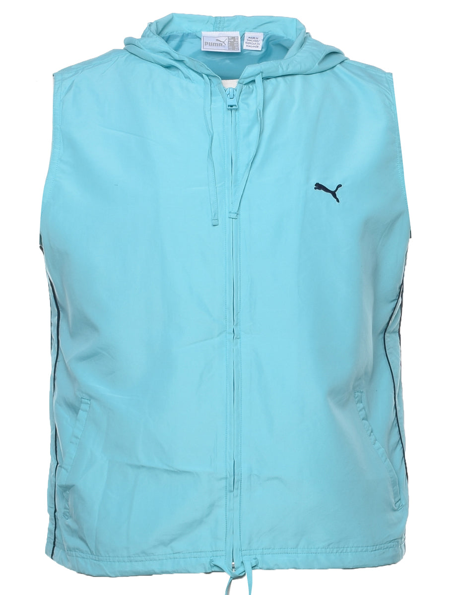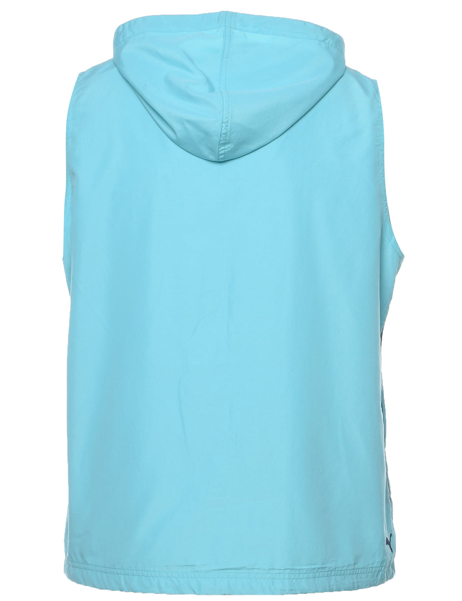 Zip front jacket comes in light blue with a hood and multiple pockets.
