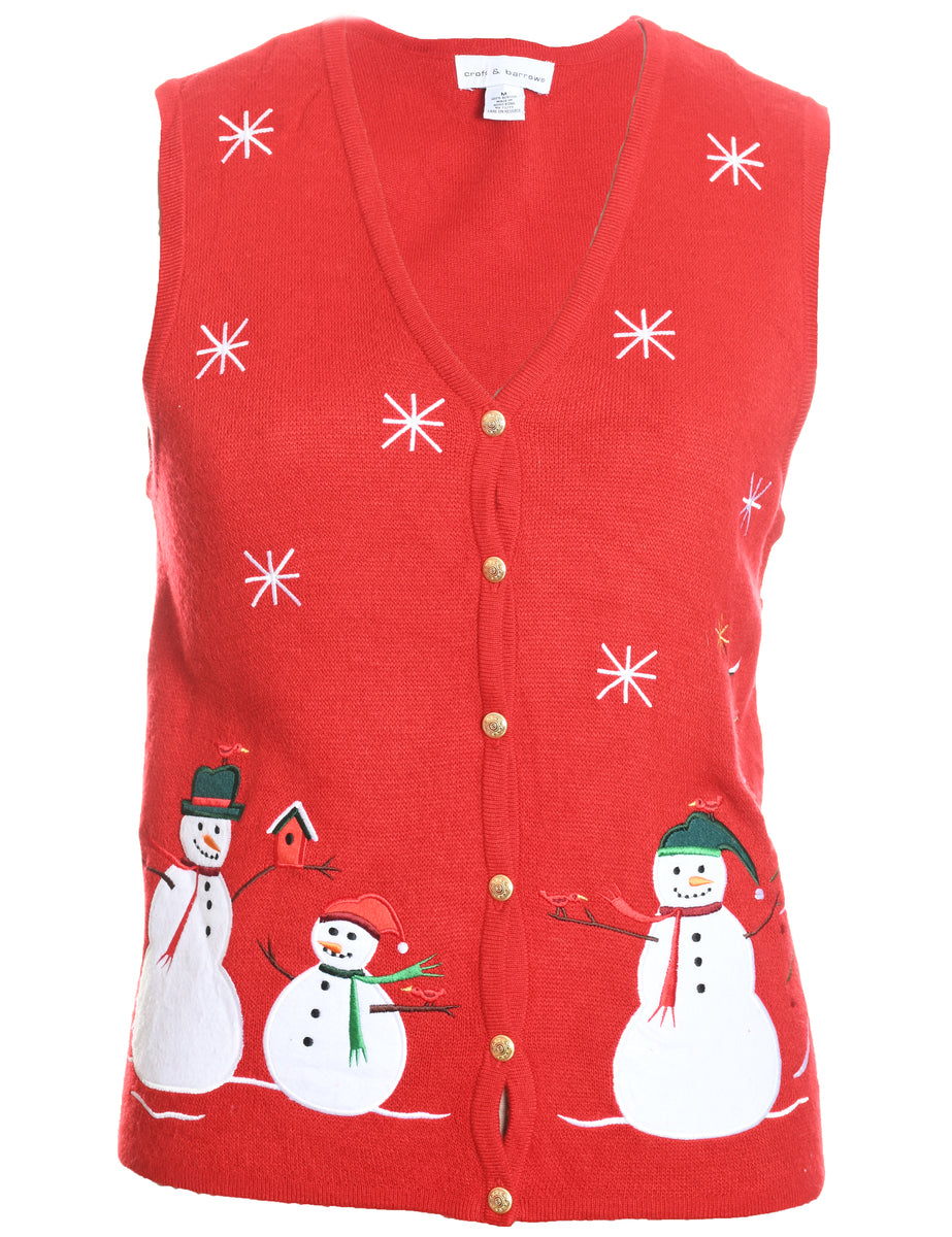 Snowman design red knit Christmas vest complete with a v-neck and an applique design.