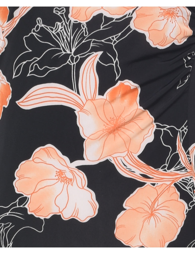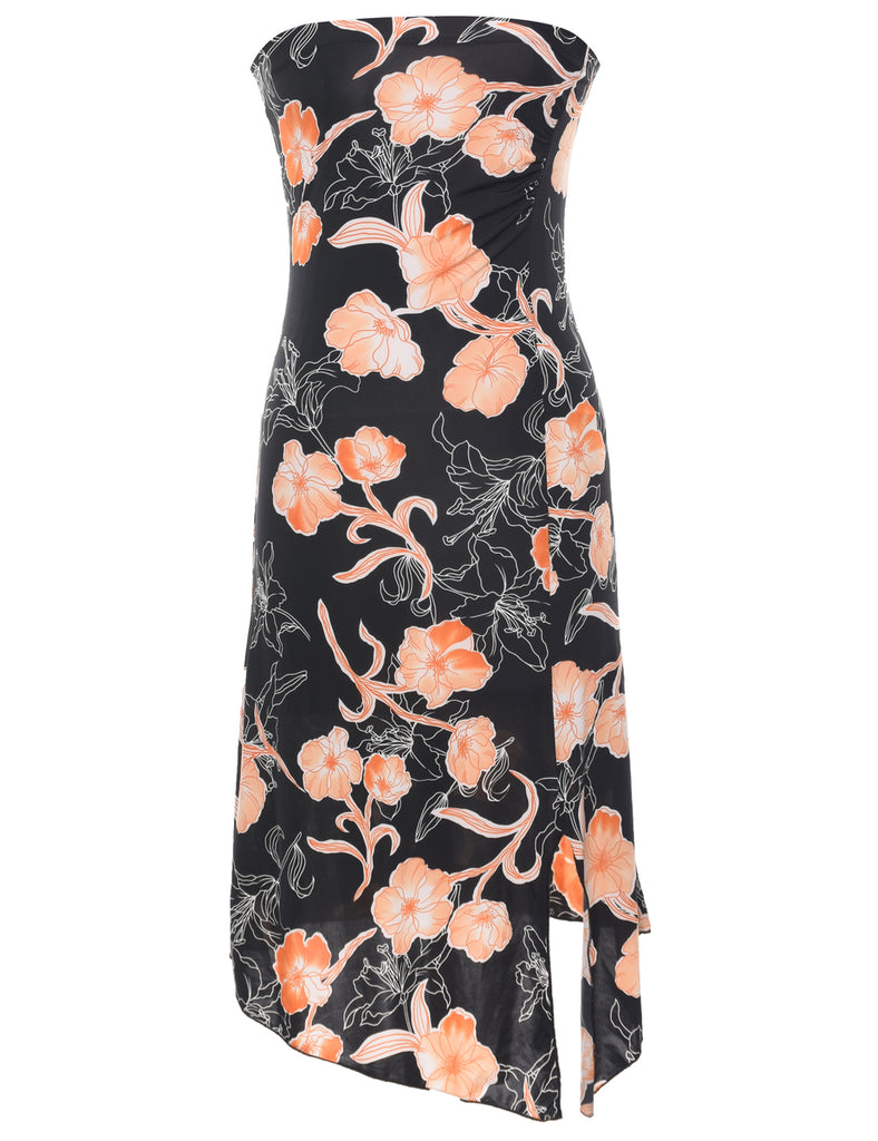 Strapless dress in black with floral pattern, an asymmetric hem and elasticated bust.