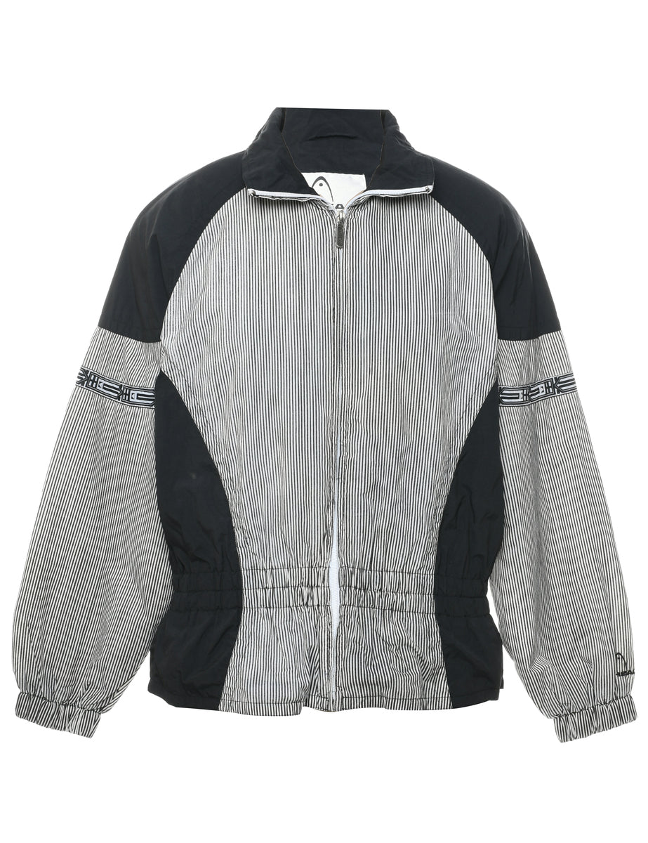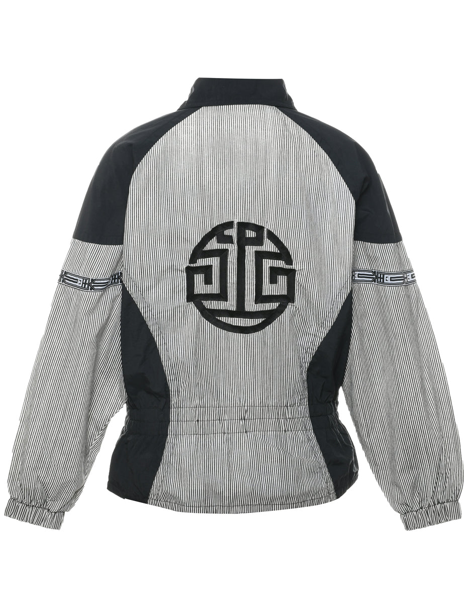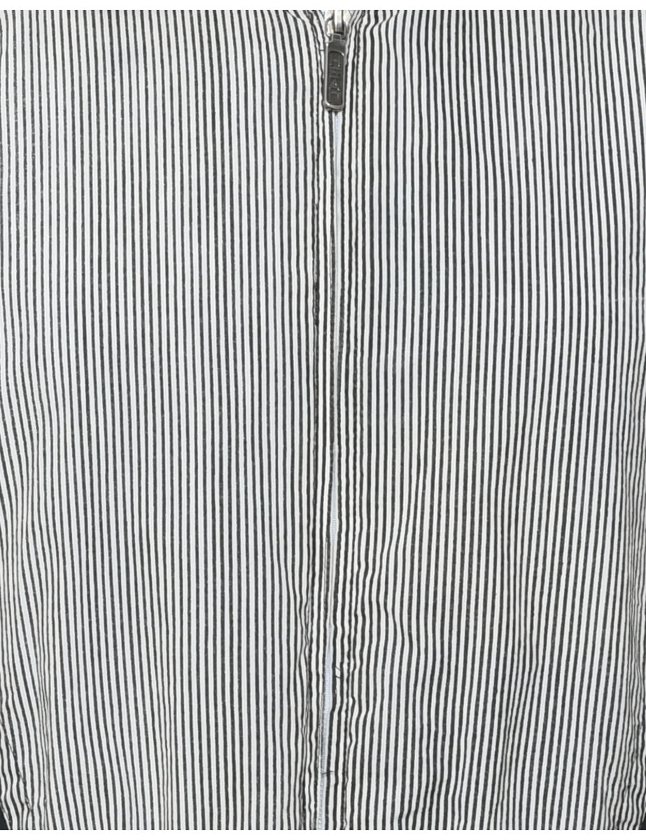Striped jacket comes in grey & black with multiple pockets and shoulder pads.
