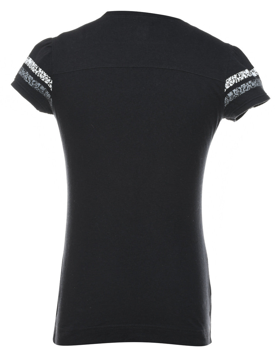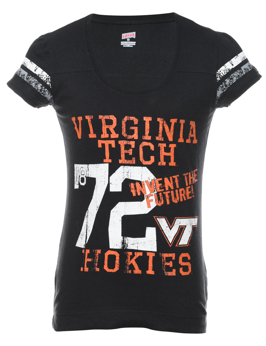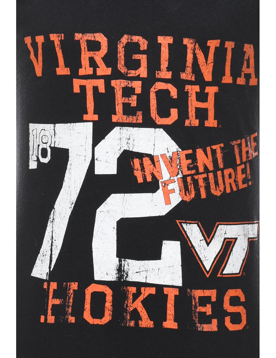 Virginia Tech Hokies football sports t-shirt in black, orange & white. The size label mentions M but based on the actual measurements we consider it a size S.