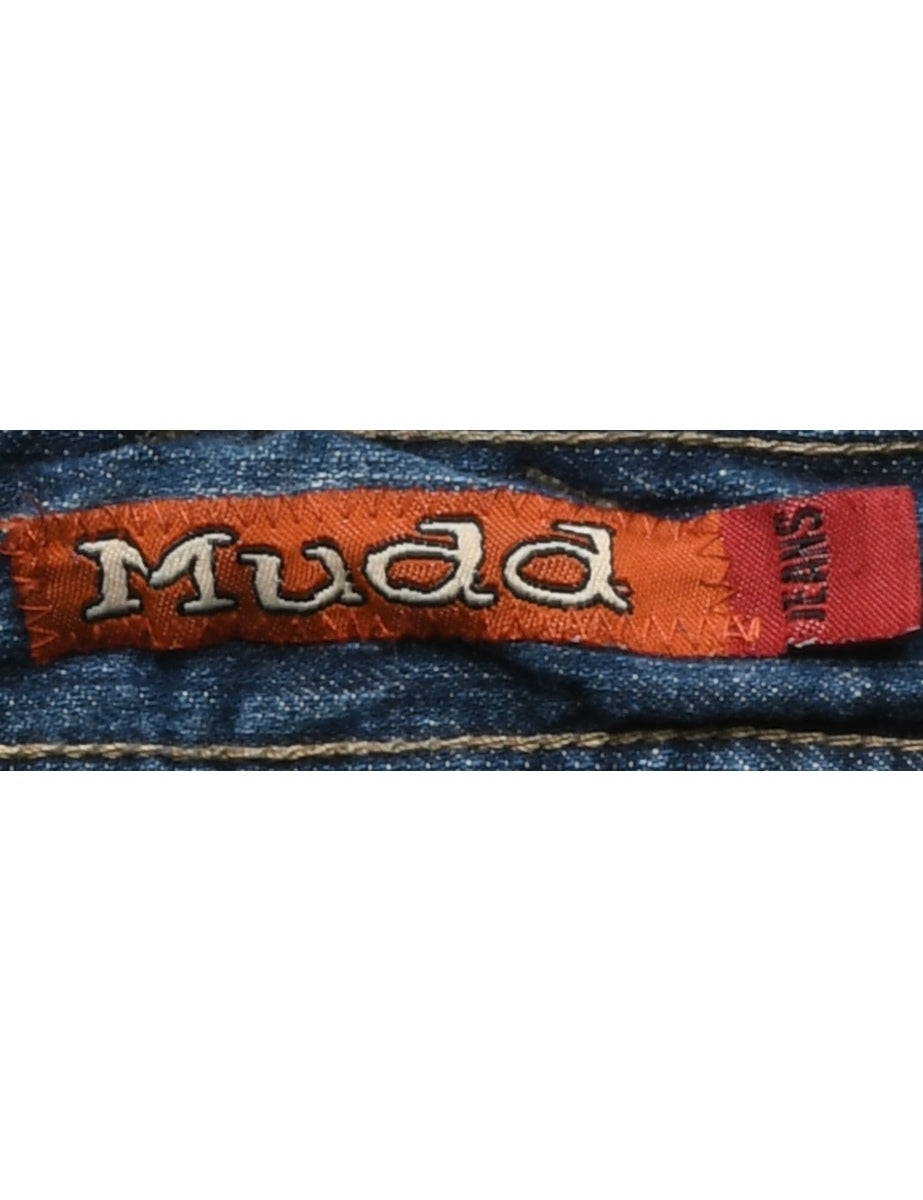 A-line denim skirt in medium wash with multiple pockets.