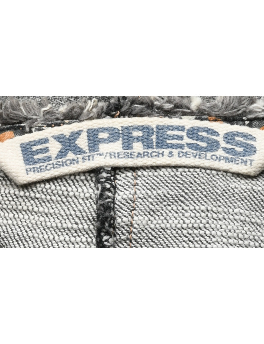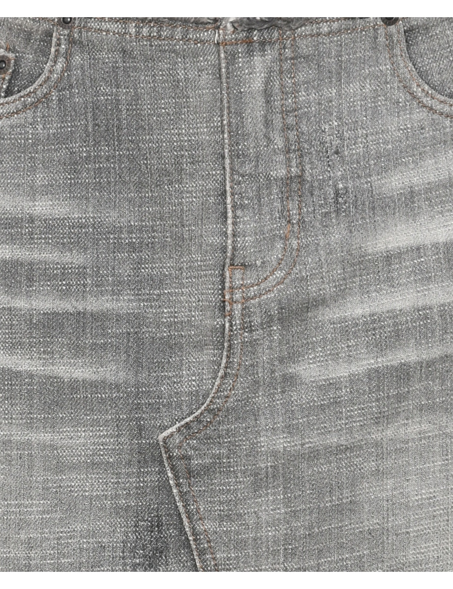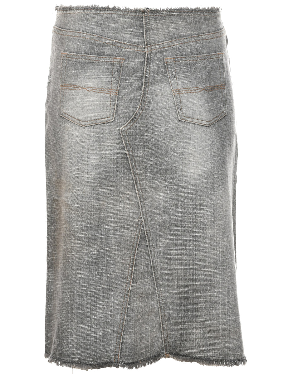 Pencil shape denim skirt comes in light grey with a frayed hem and multiple pockets.