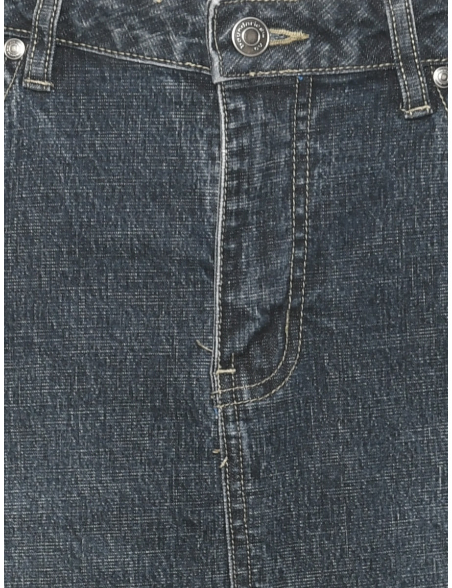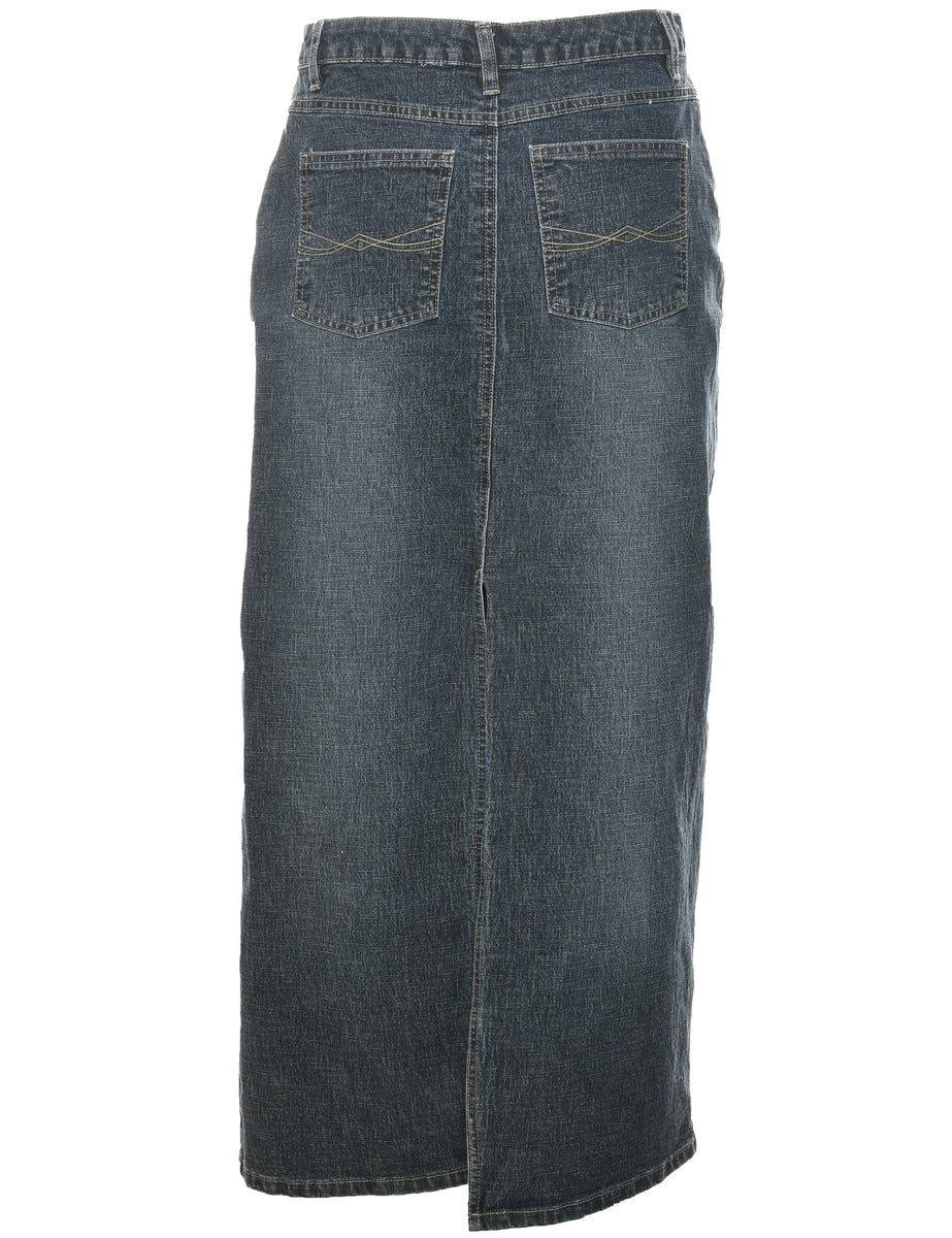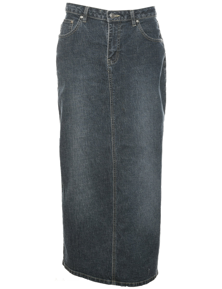 Pencil shape denim skirt comes in dark wash with multiple pockets.
