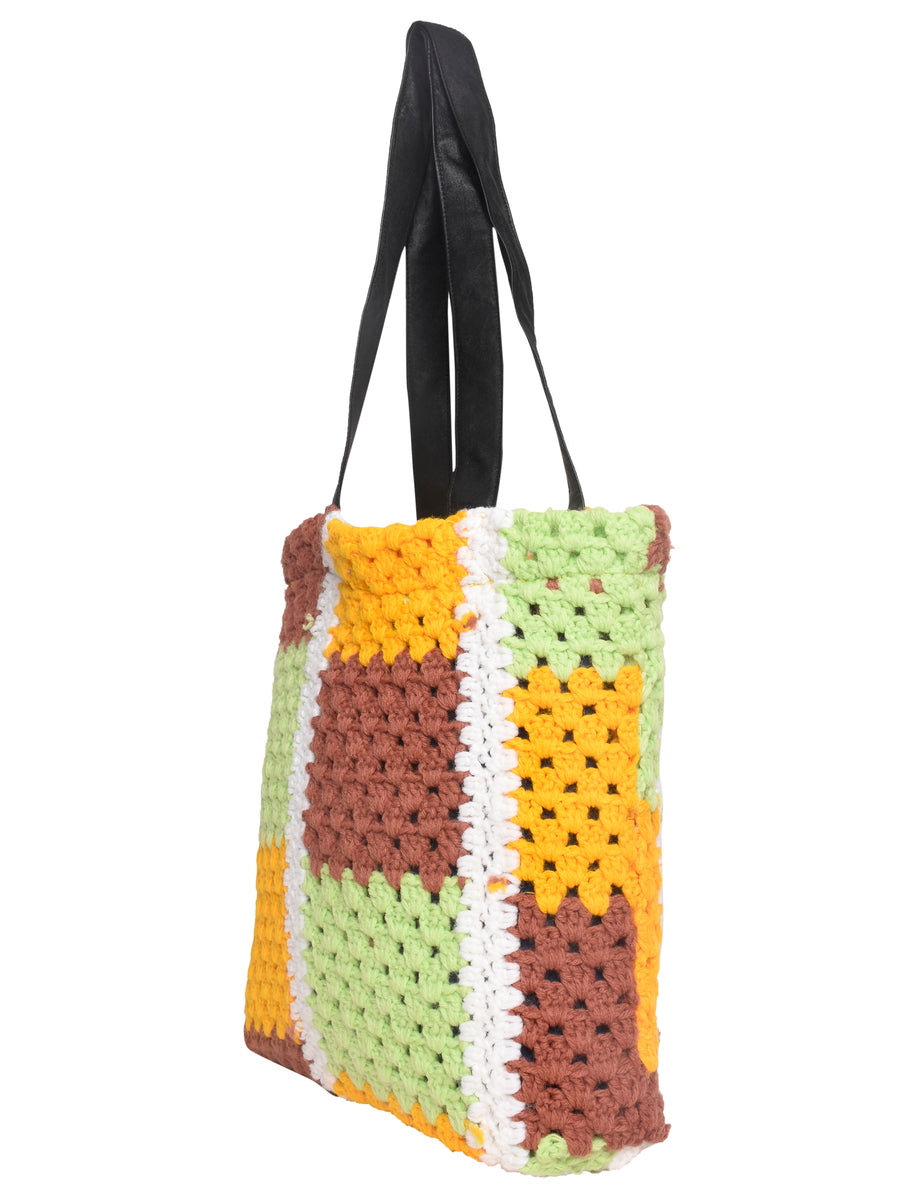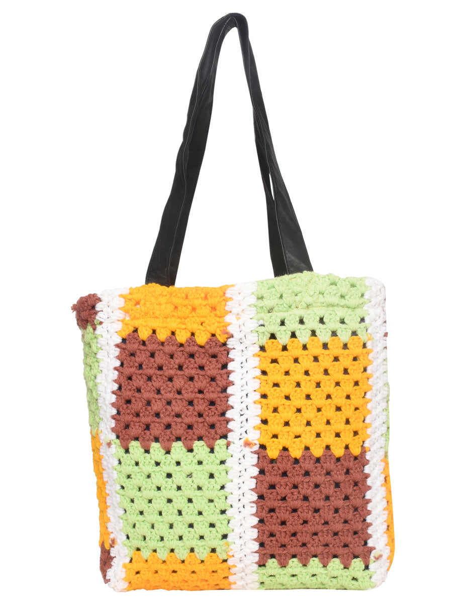 Crochet afghan tote in multi-colour with denim lining and a leather handle. From the brand Beyond Retro Label.