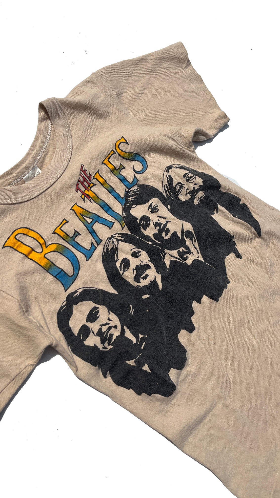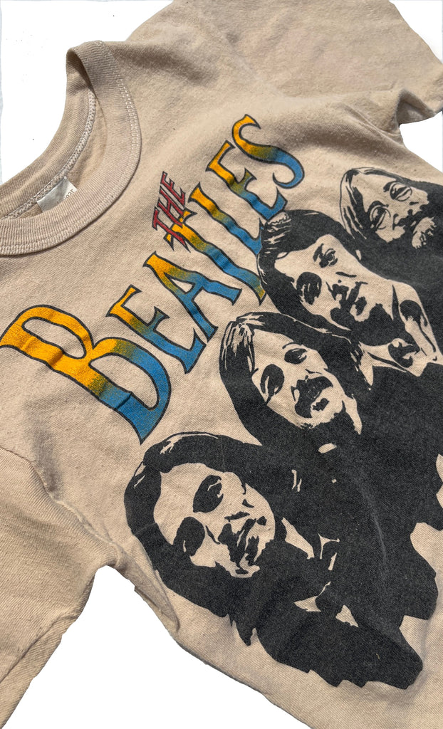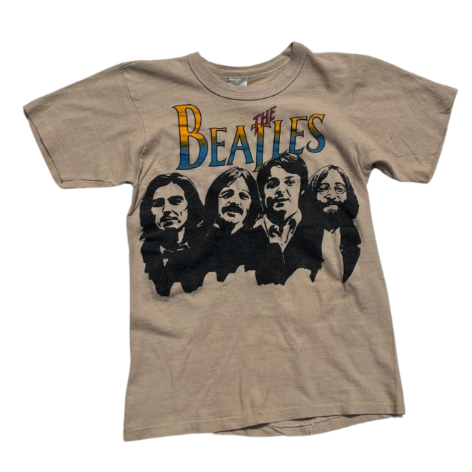 Rare and highly desirable early 1970s Beatles t-shirt, single stitch construction, made in USA on the Sportswear label. There are also examples from this period with a black background. Scarce in this skinny size.