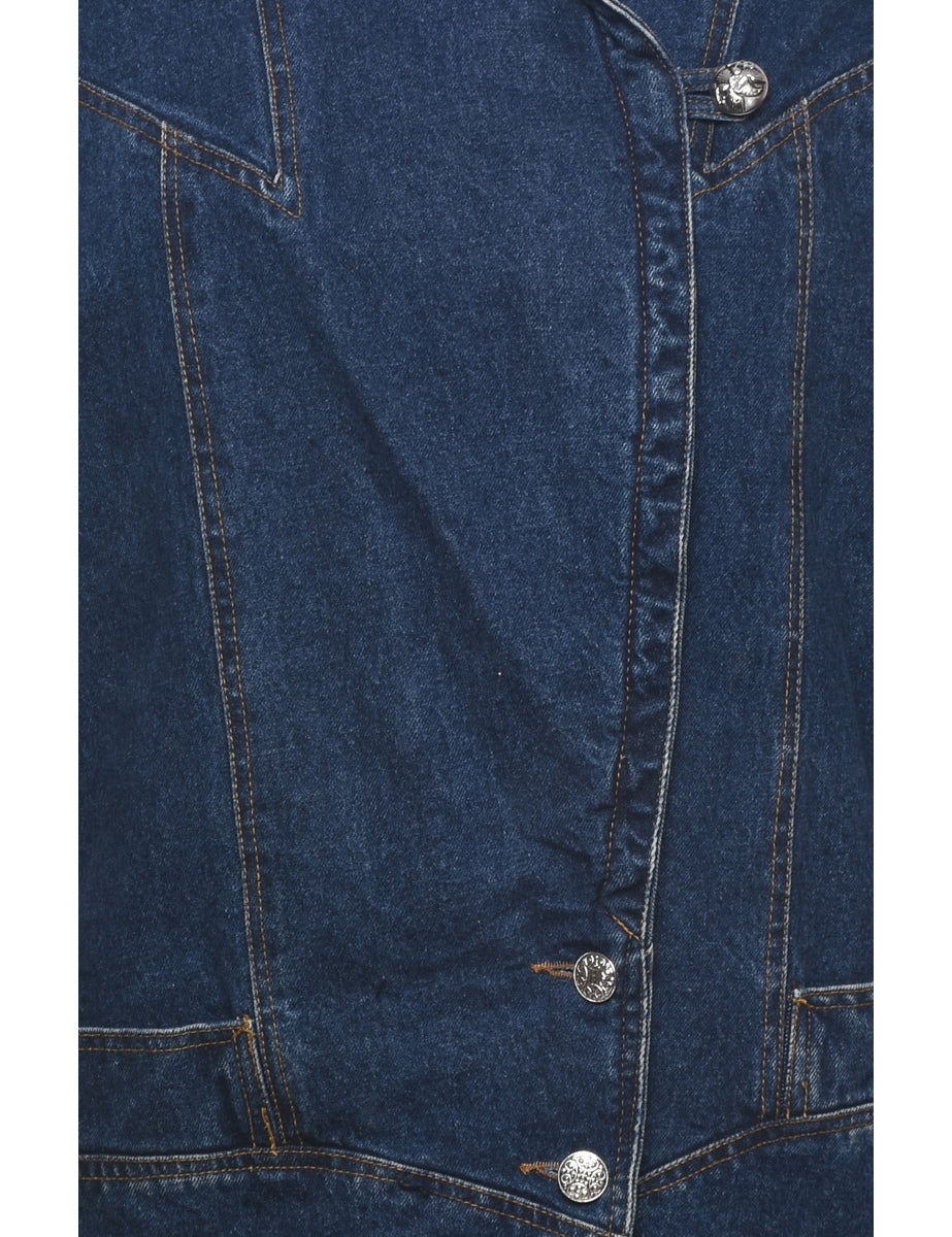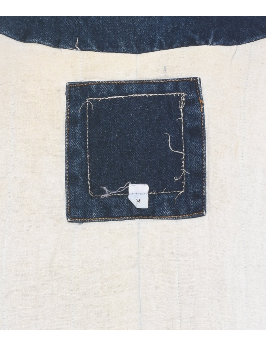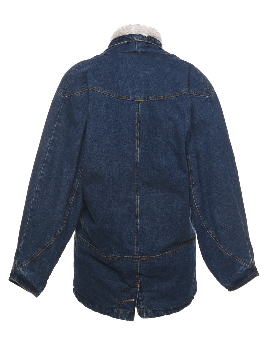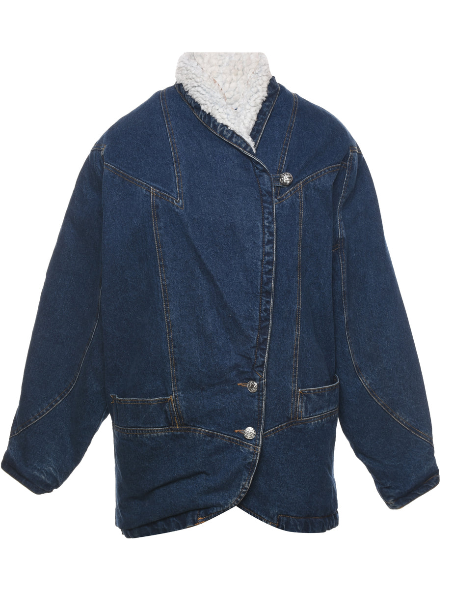 Classic shearling denim jacket. Comes in dark wash with faux shearling collar and multiple pockets.