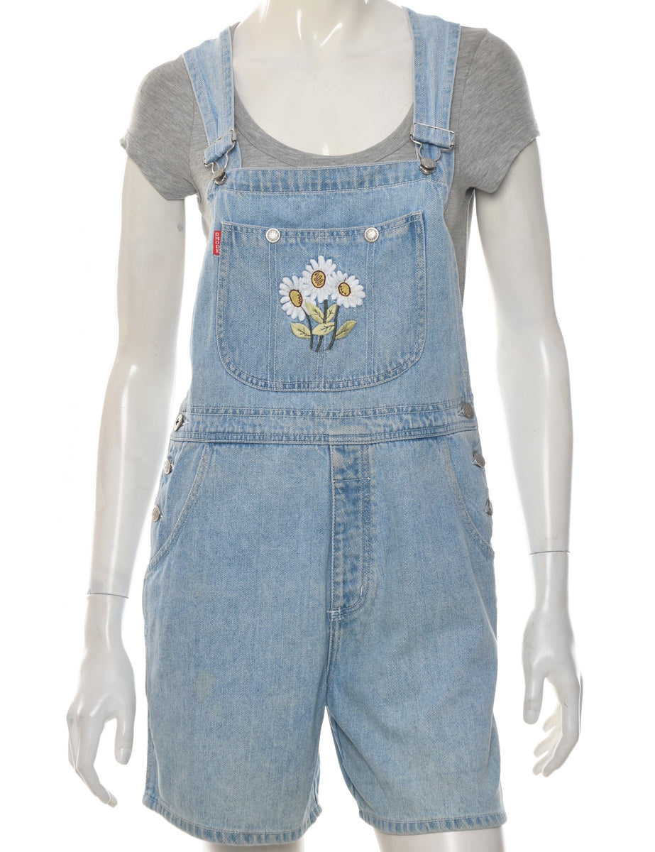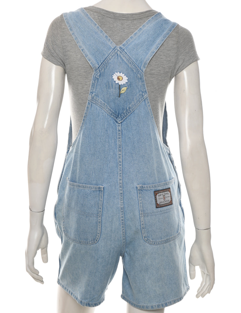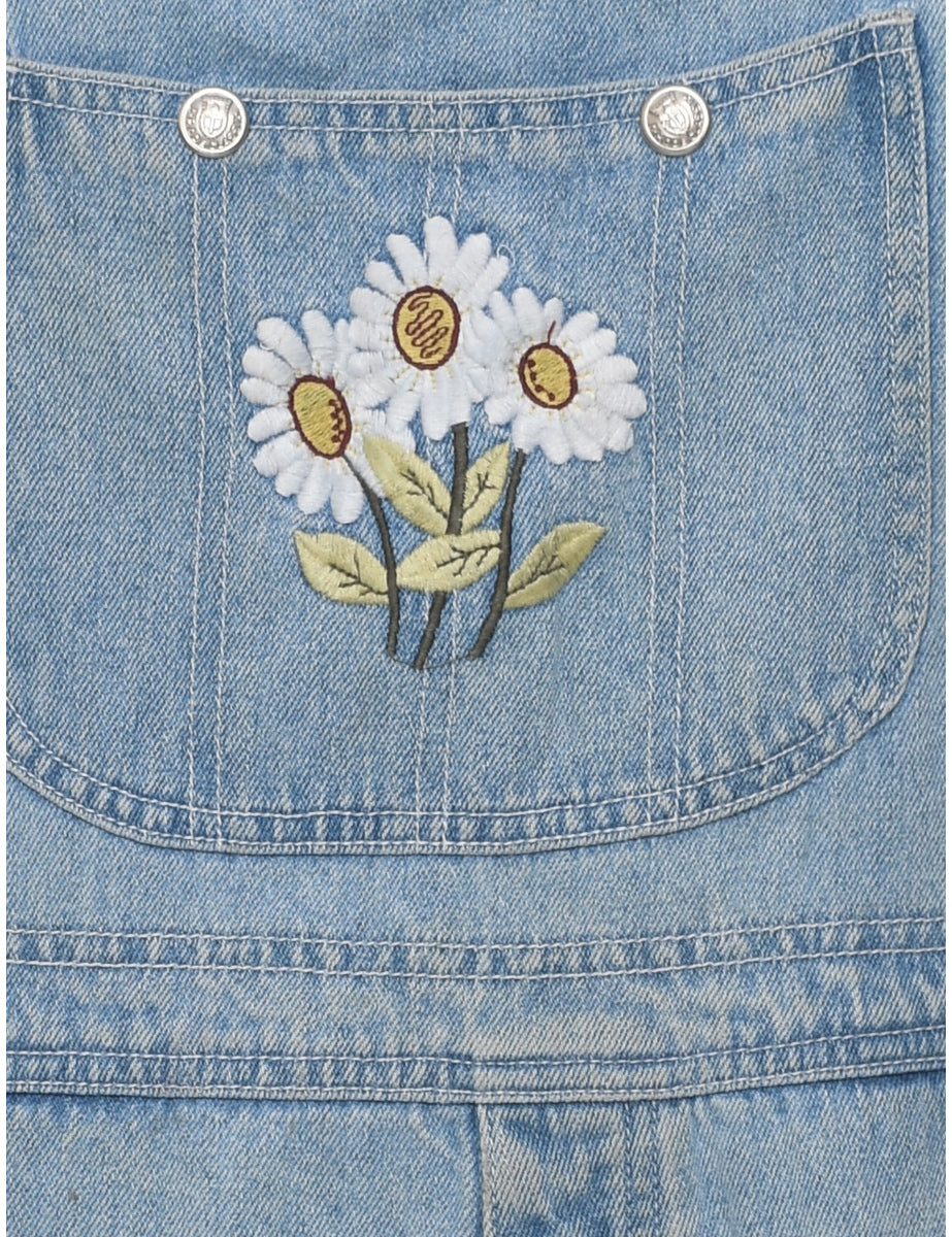 Floral cropped dungarees in light wash with embroidery and adjustable strap.