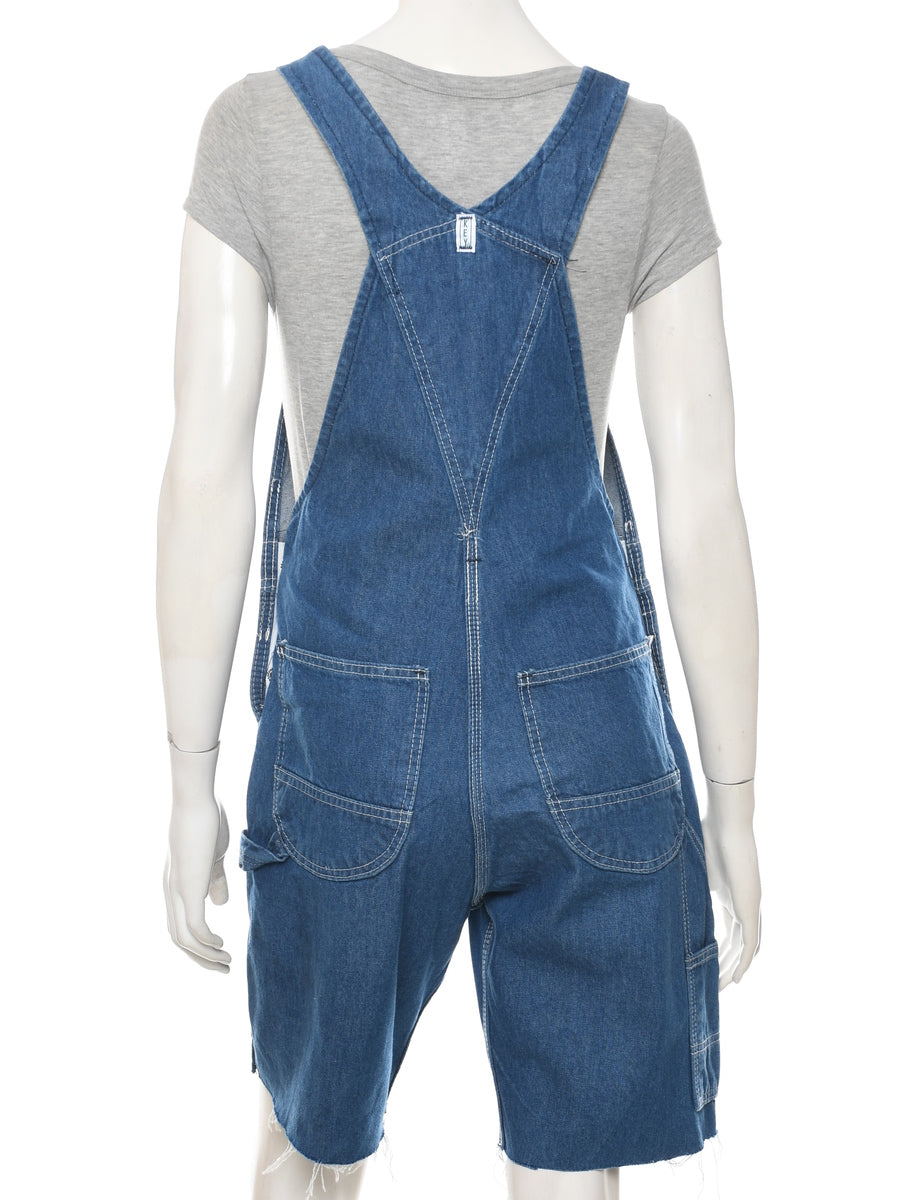 Frayed hem cropped dungarees. Comes in medium wash with adjustable strap and multiple pockets.