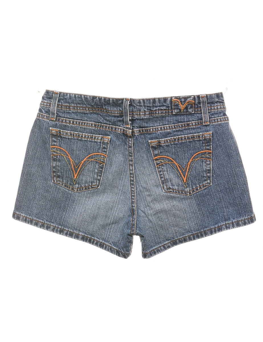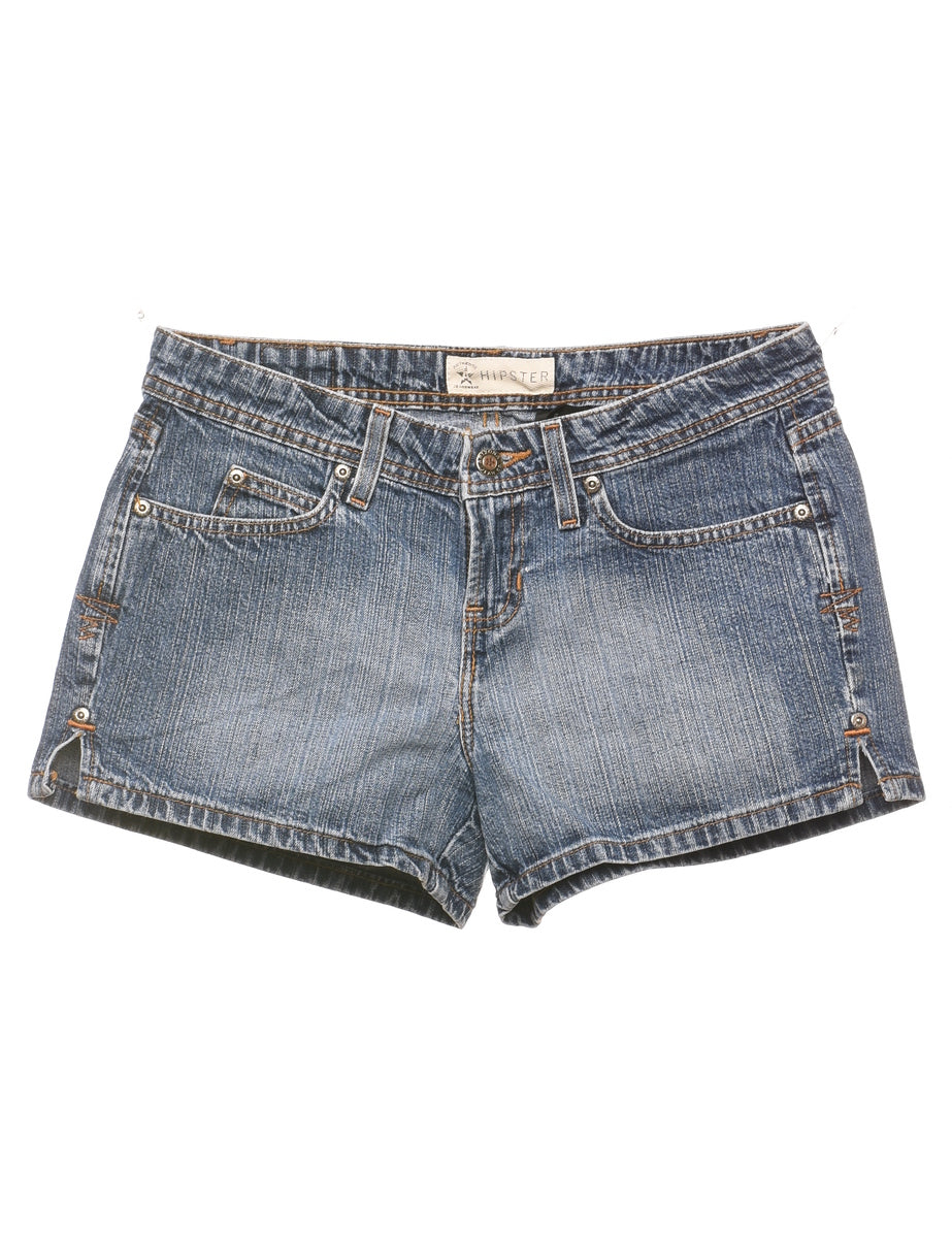 Hipster denim shorts. Comes in faded wash with embroidery and multiple pockets.