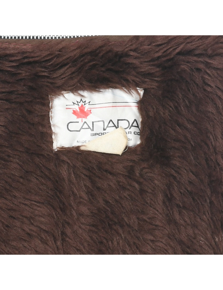 Zip front leather jacket in dark brown with faux shearling lining and multiple pockets. From the 1980s.
