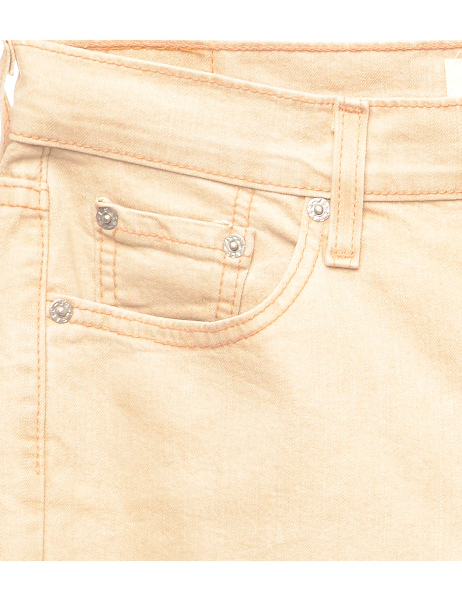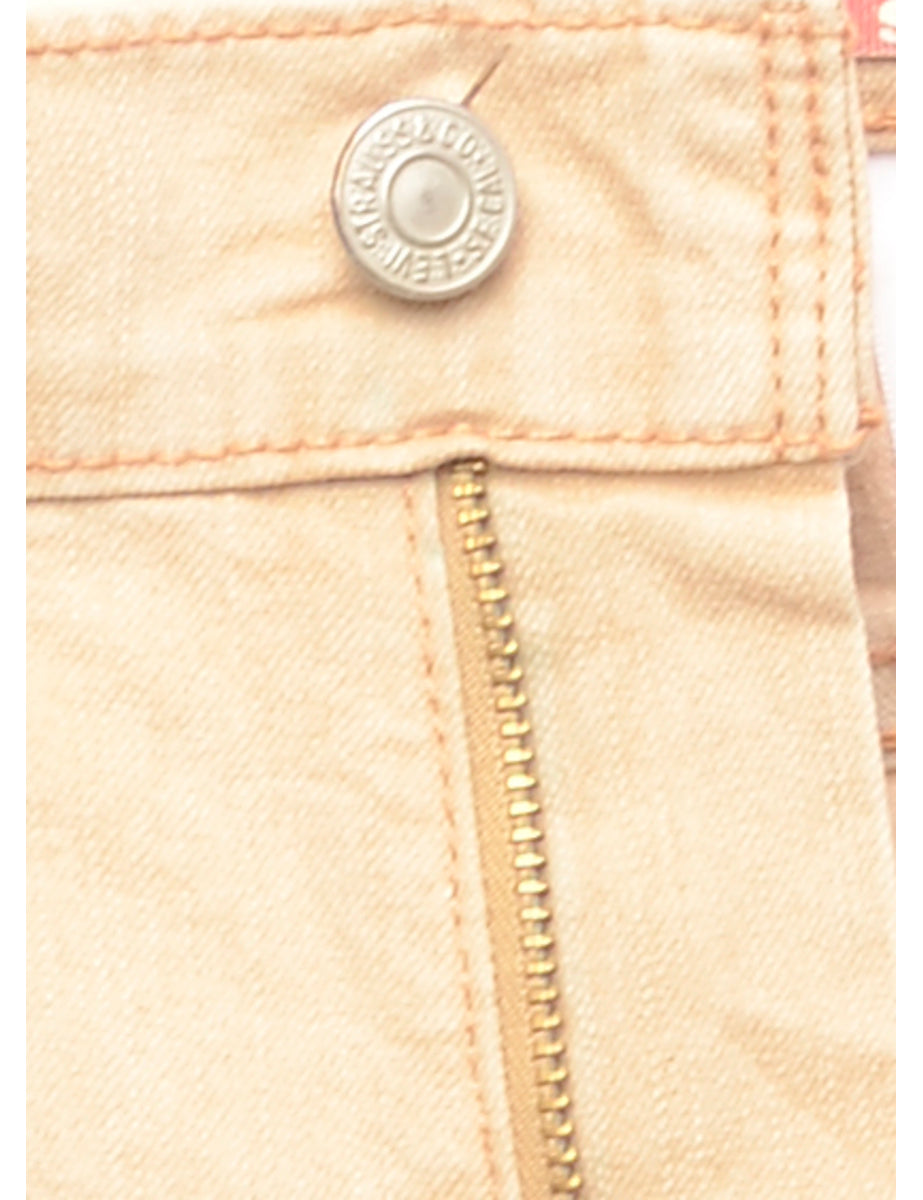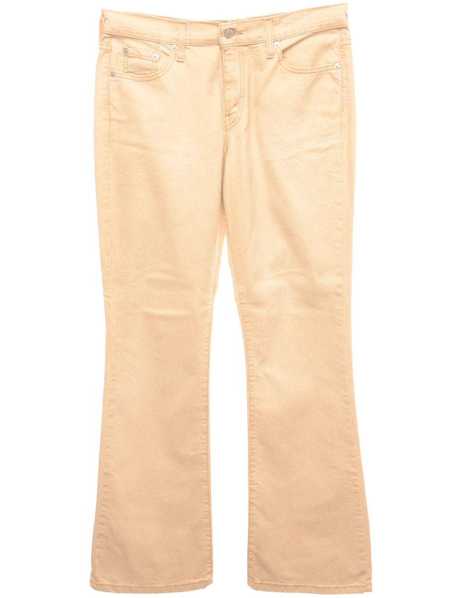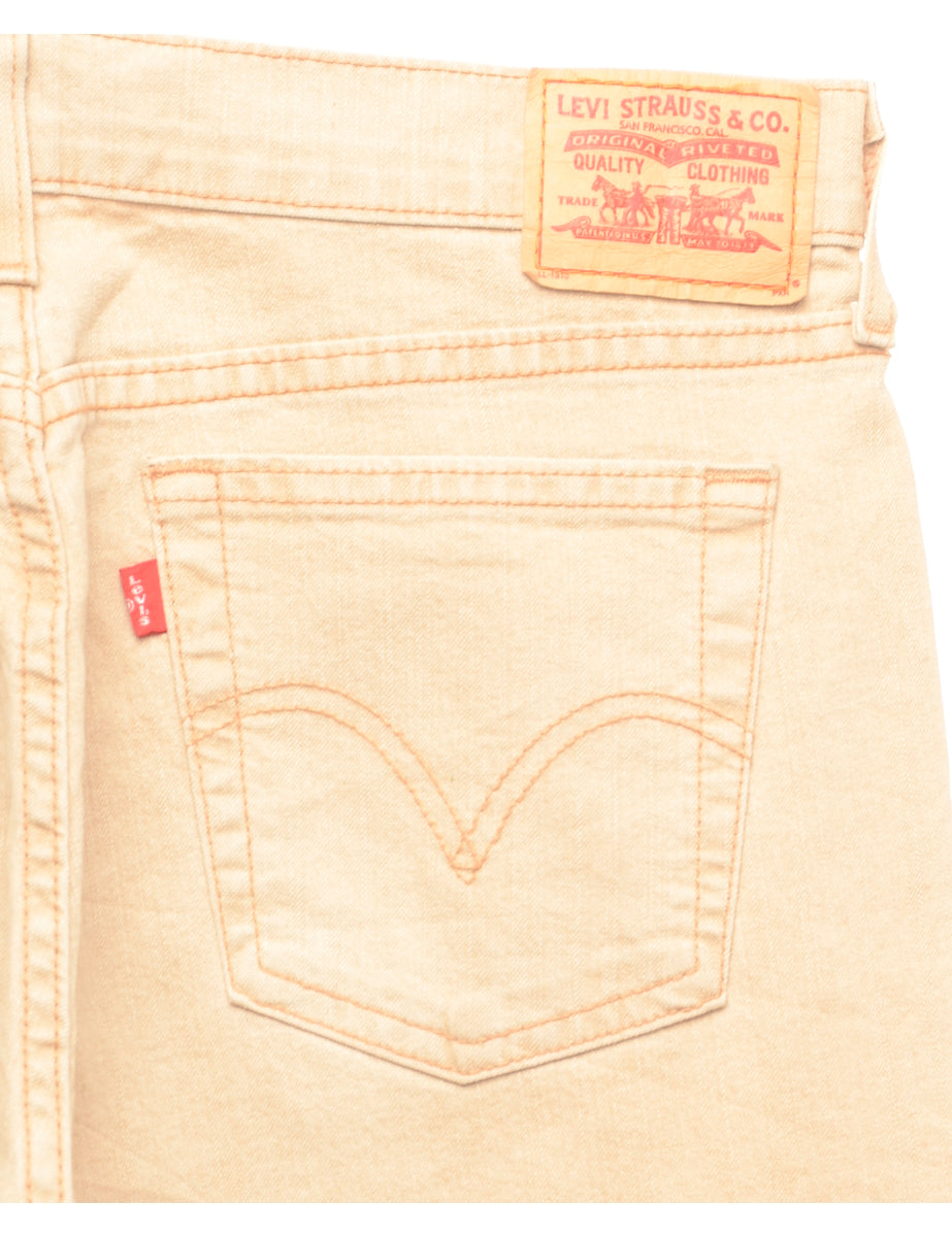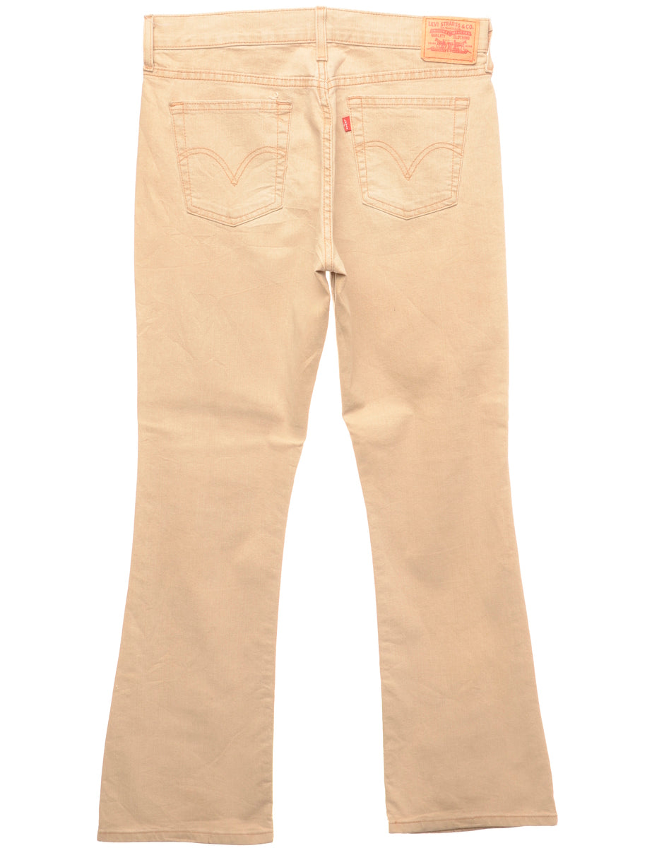 Boot cut light brown levi's jeans with pockets.