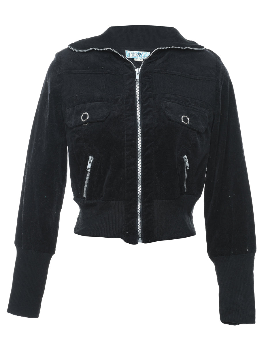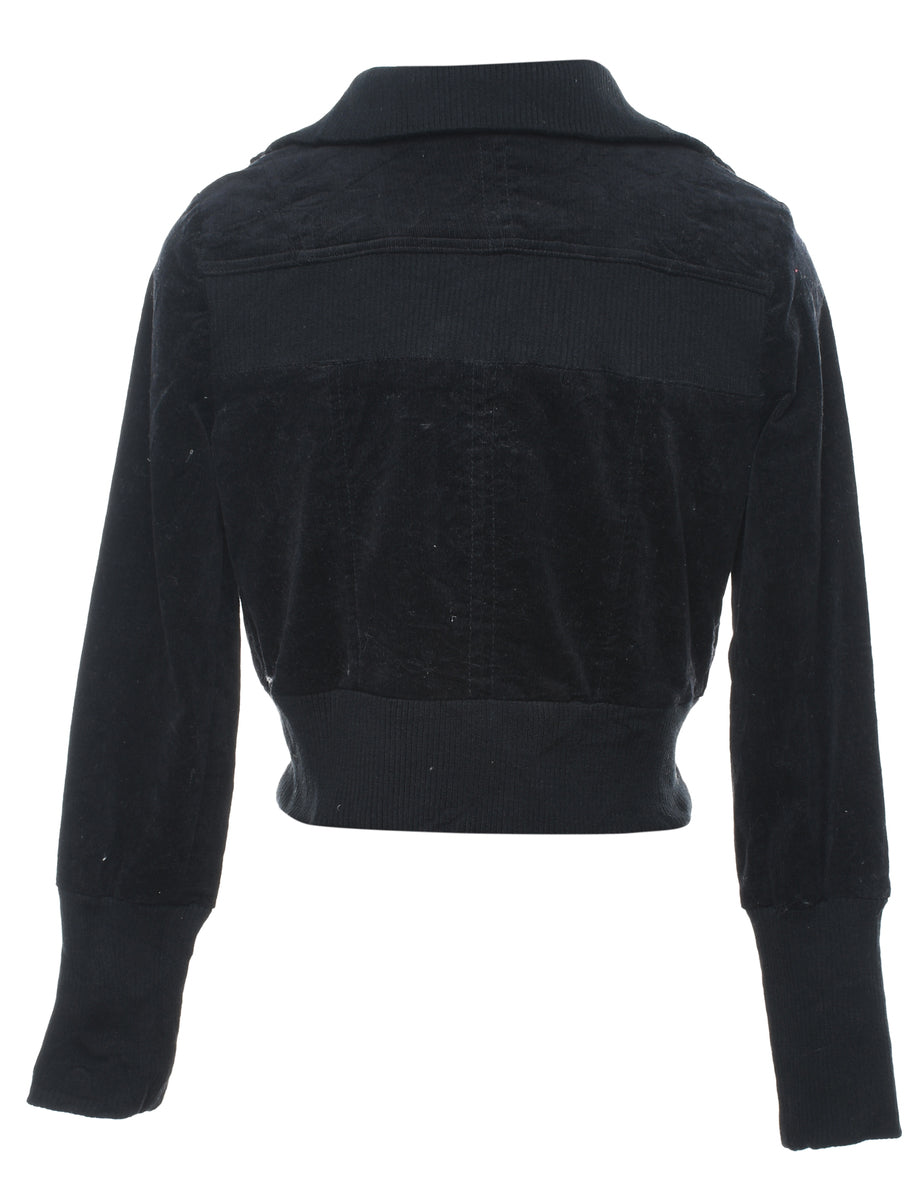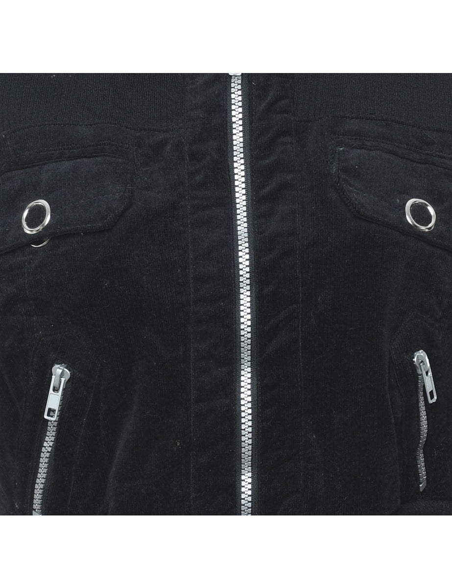 Corduroy cropped jacket in black with zippered pockets.