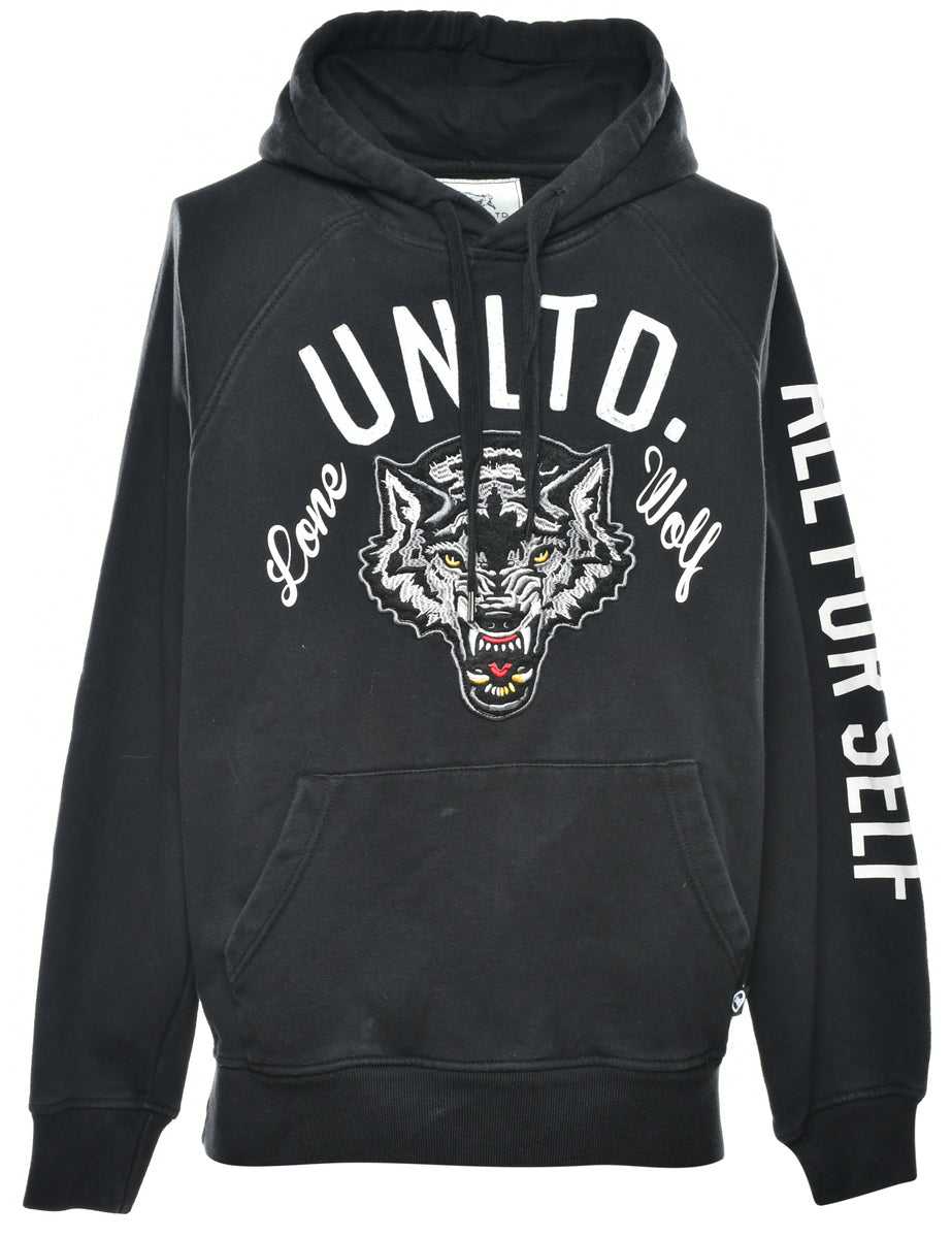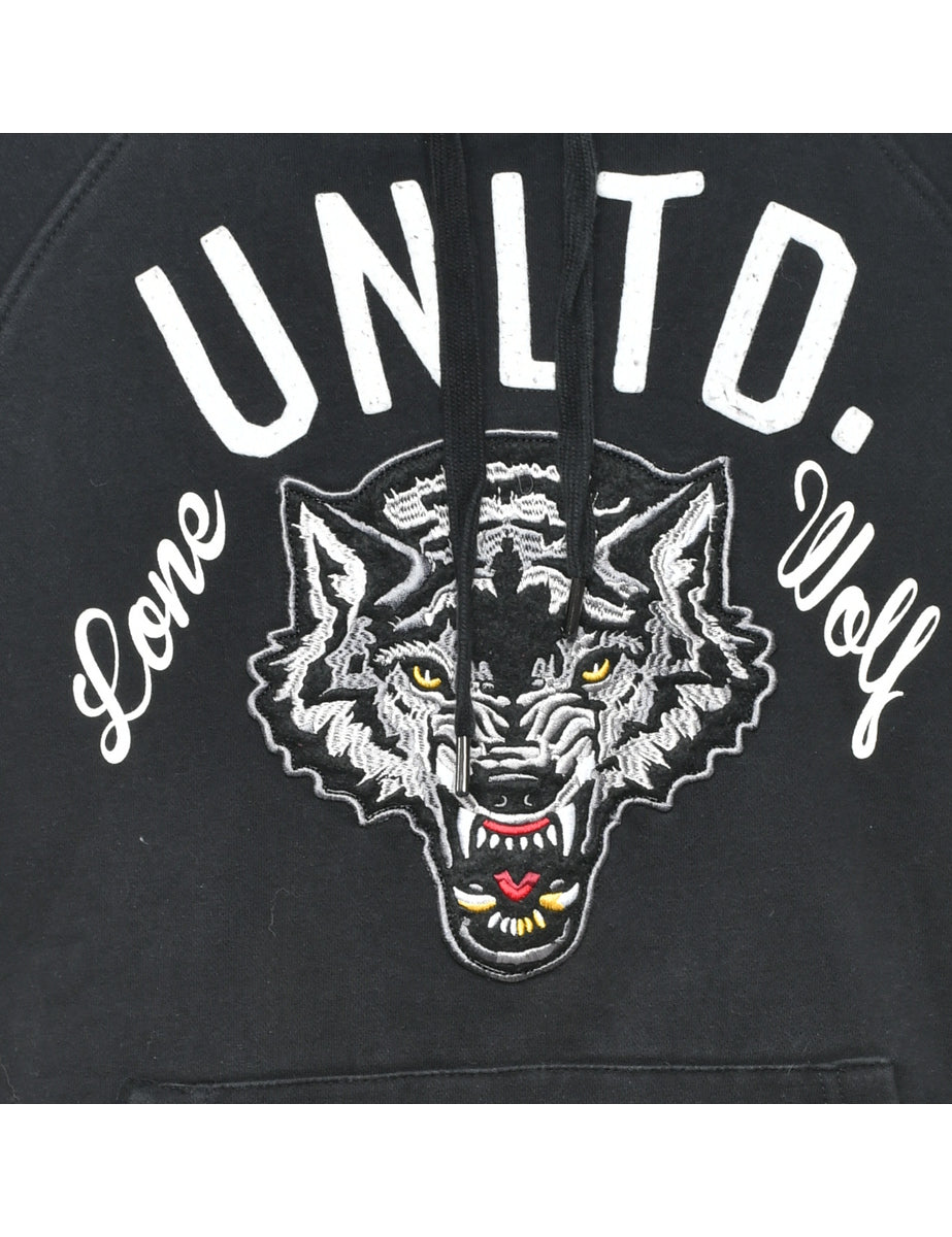 Black lone wolf hoodie with patchwork applique and raglan sleeves.