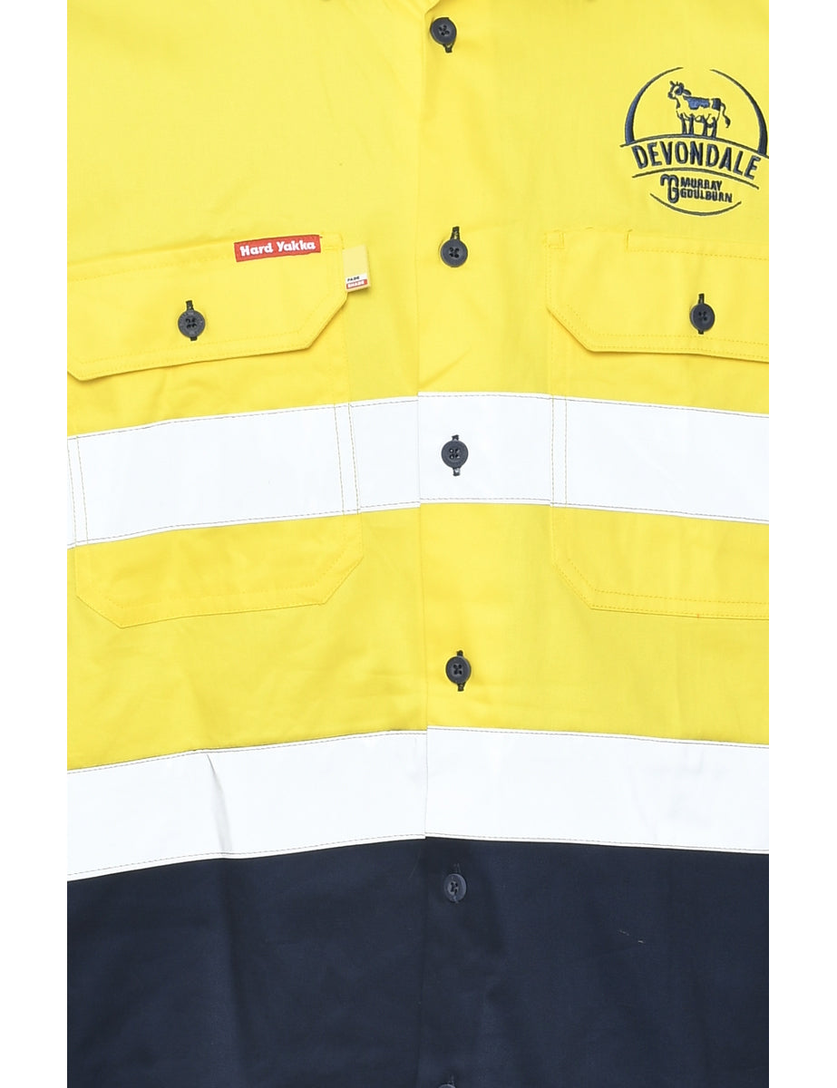 Long sleeved workwear shirt. Comes in yellow with a classic collar and shiny silver trim.