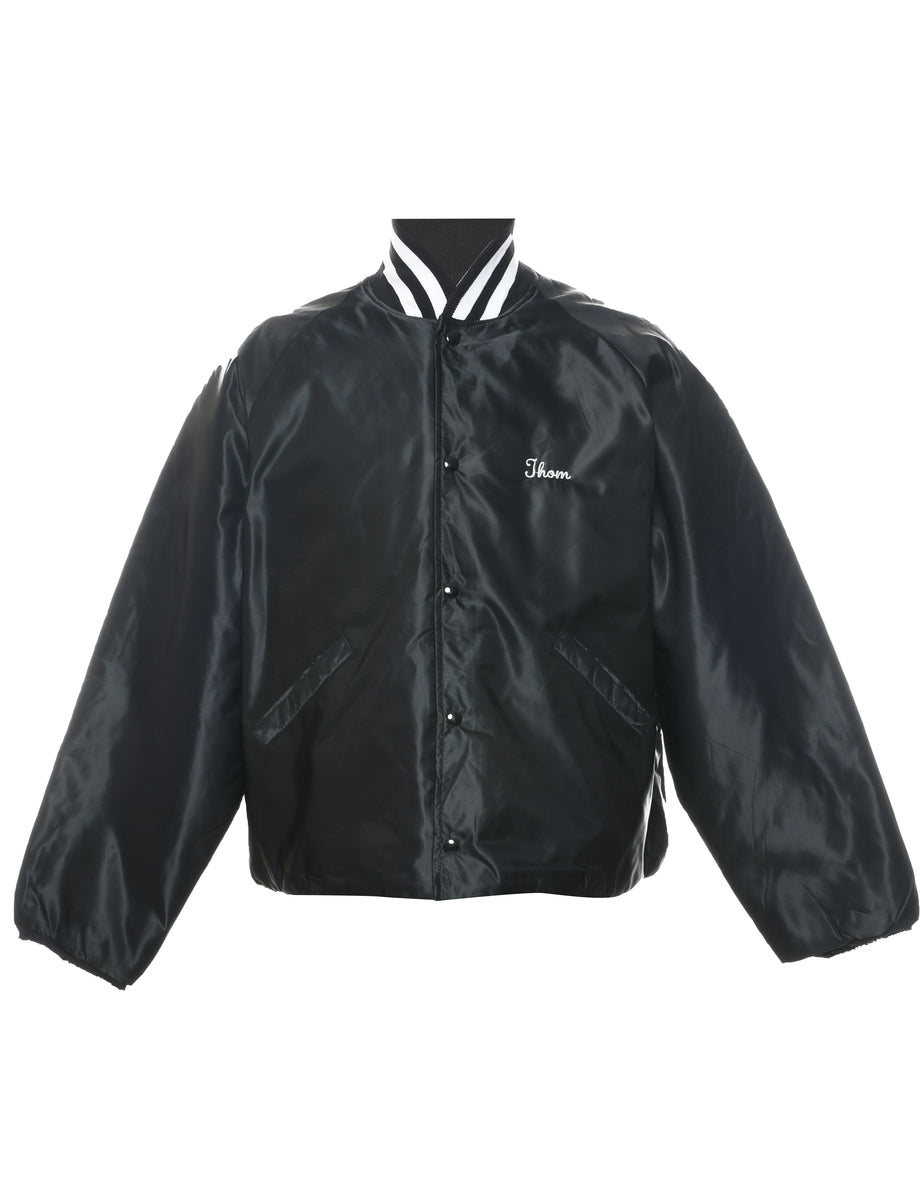 Nylon jacket comes in black with multiple pockets and raglan sleeves.