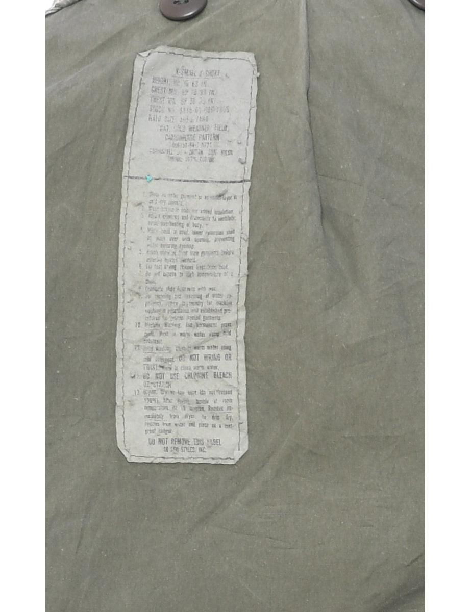Button front multi-colour military jacket with camouflage print, multiple pockets.