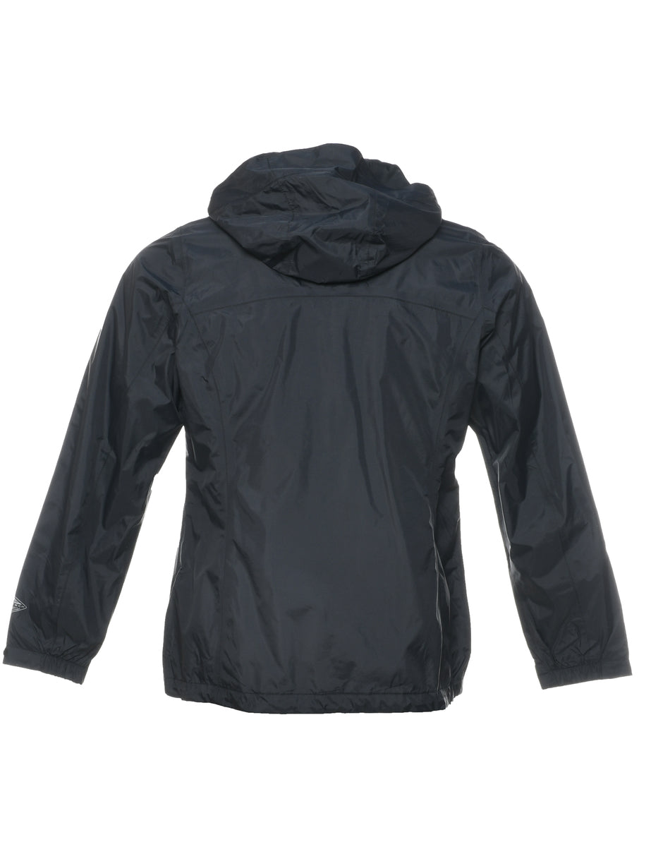 Hooded nylon jacket. Comes in black with multiple pockets.