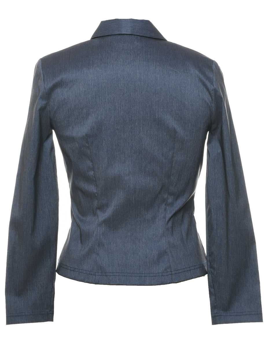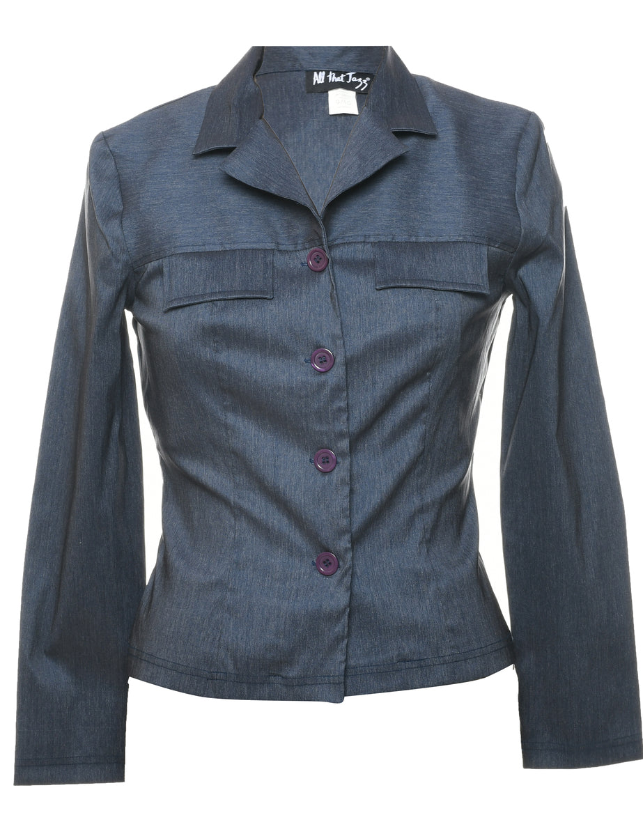 Button front jacket comes in dark grey with multiple pockets and shoulder pads.