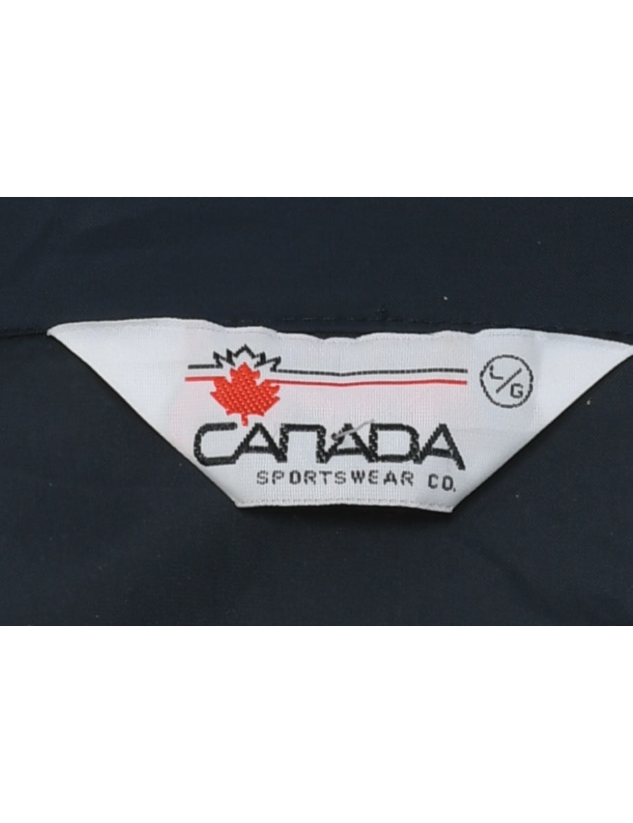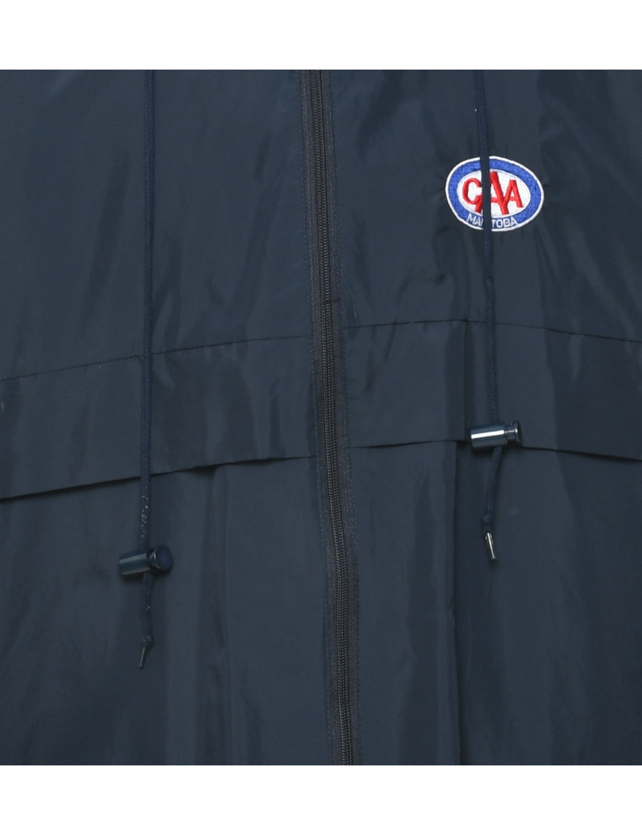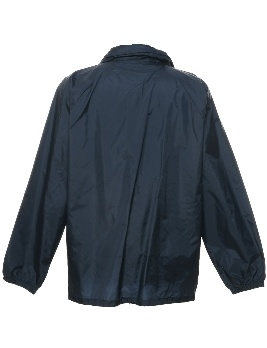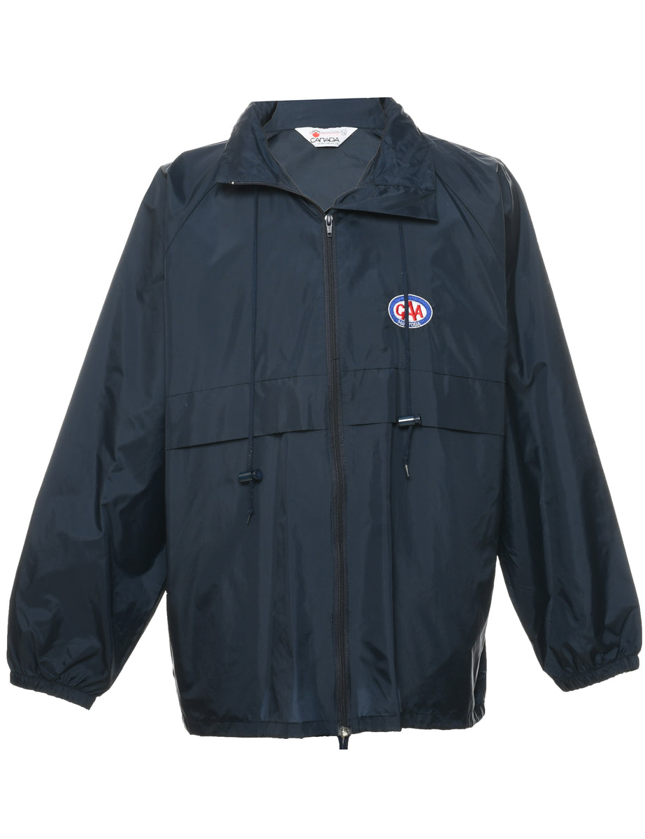 Zip front nylon jacket in navy with multiple pockets and raglan sleeves.