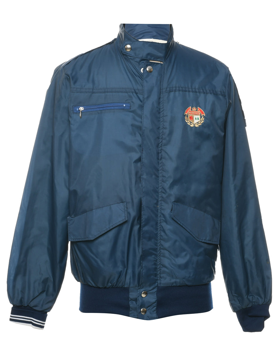 Zip front nylon jacket in navy with epaulettes and multiple pockets.