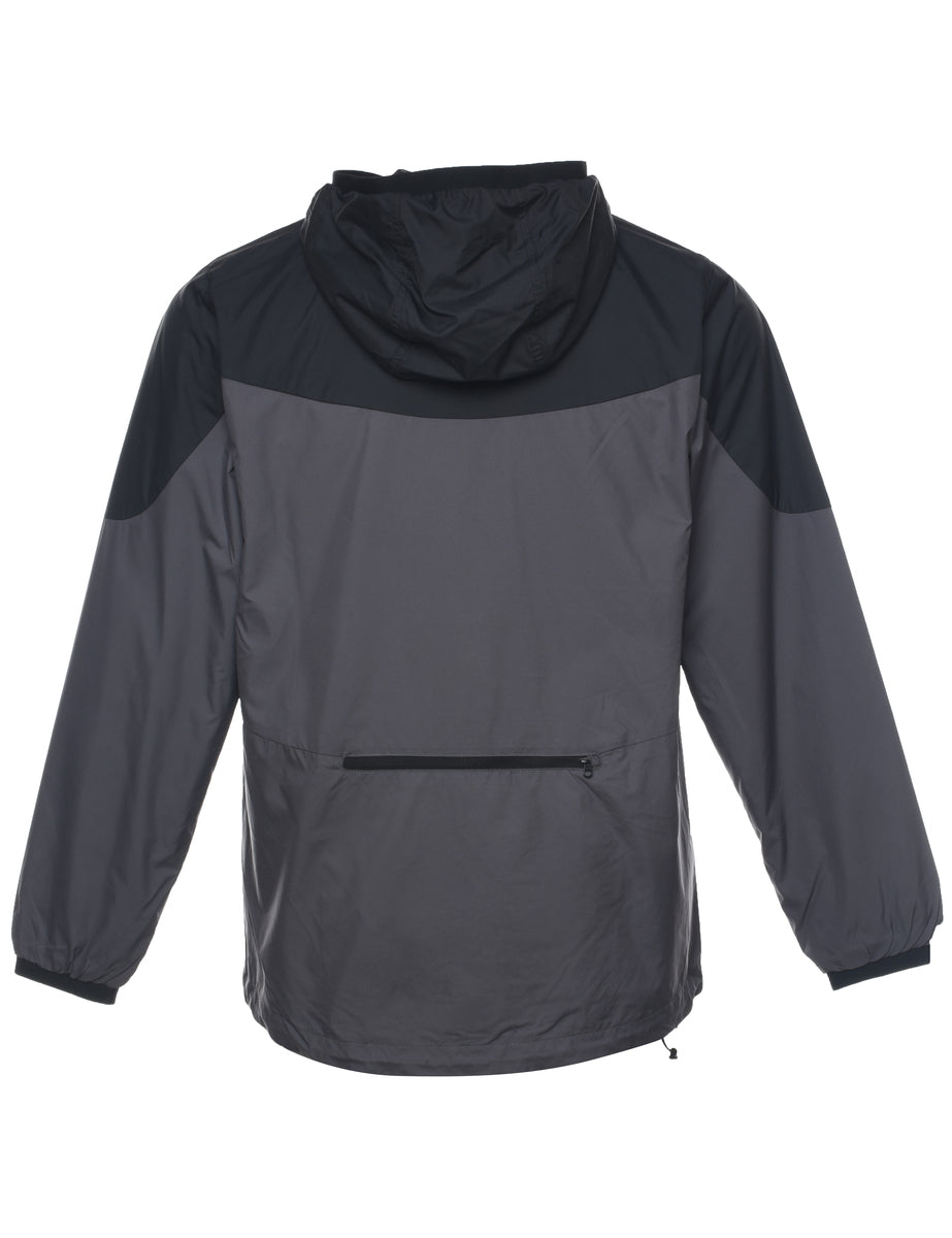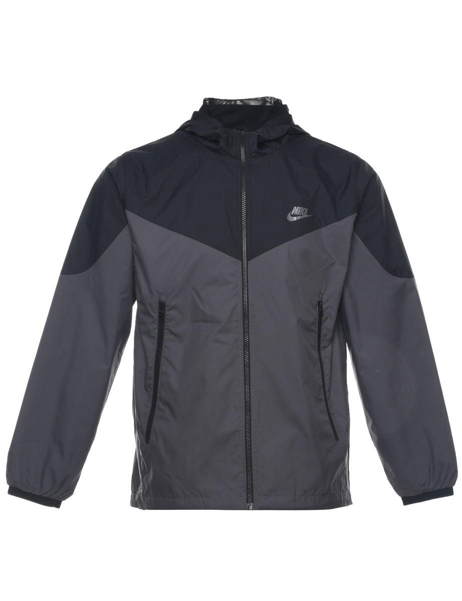 Two tone black & dark grey Nike jacket with a hood and multiple pockets.