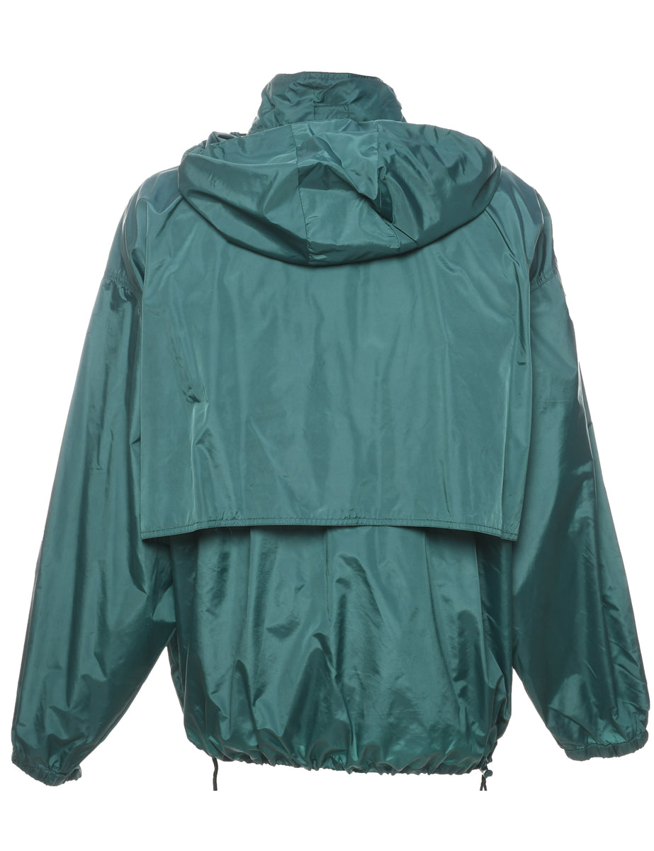 Zip front nylon jacket in green with a hood and multiple pockets.