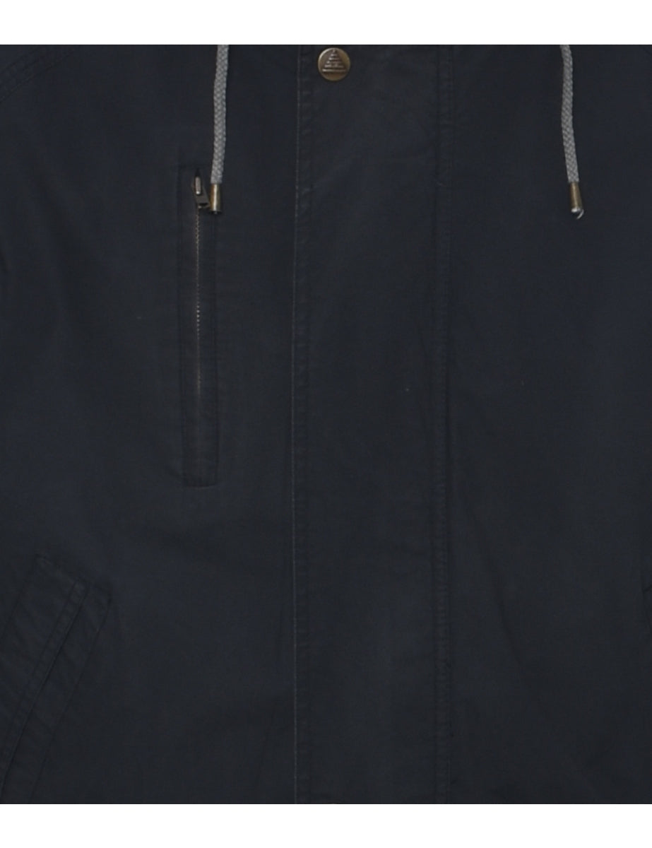 Zip front jacket comes in black with multiple pockets and raglan sleeves.