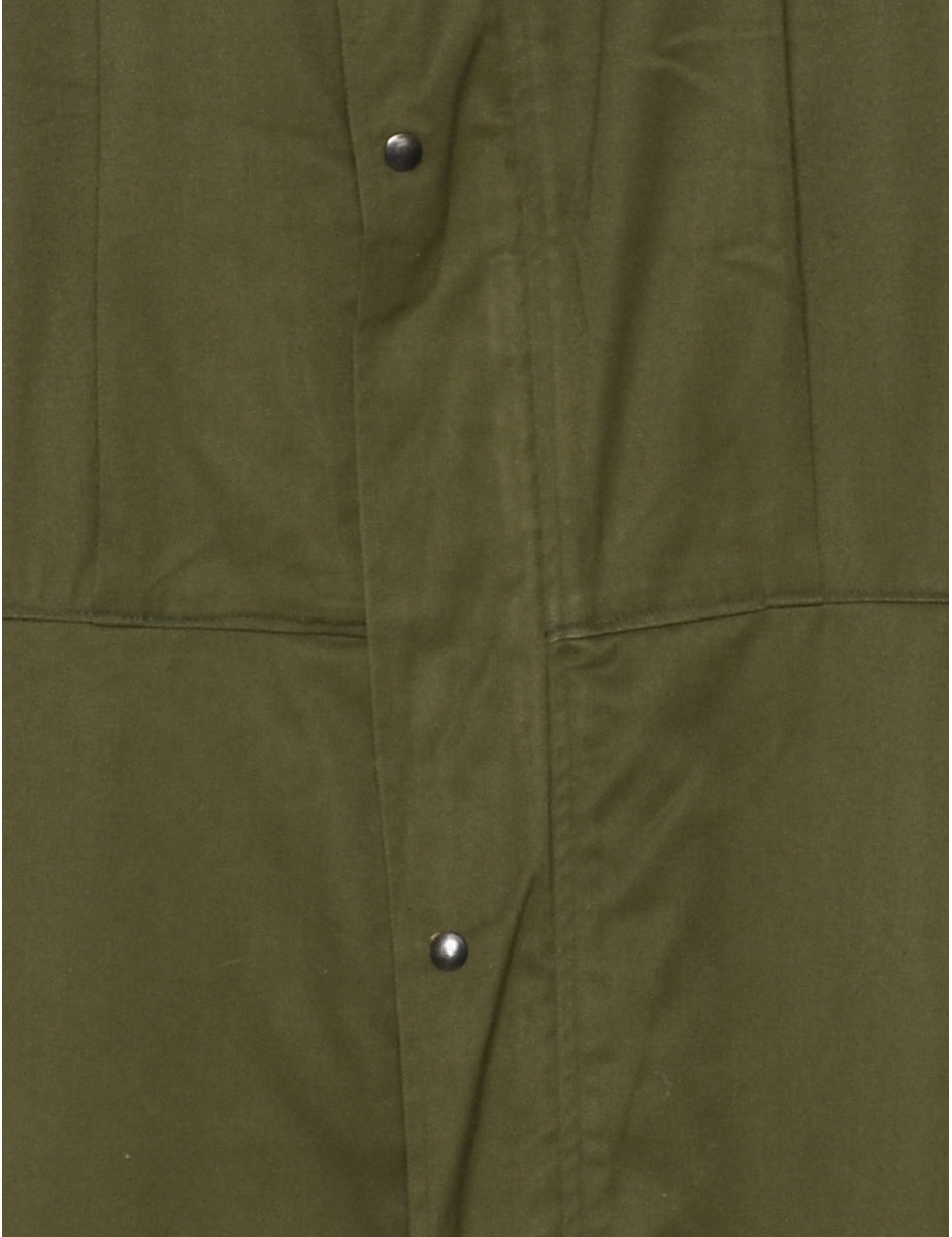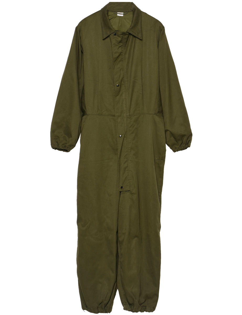 Zip front army boiler suit in olive green with a classic collar and multiple pockets.