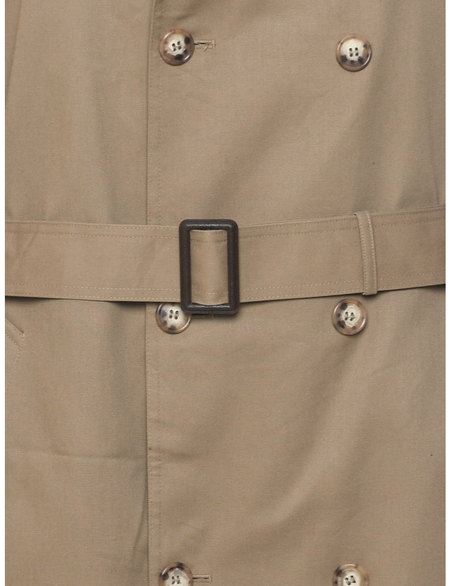 Double breasted trench coat comes in beige with epaulettes and pockets.