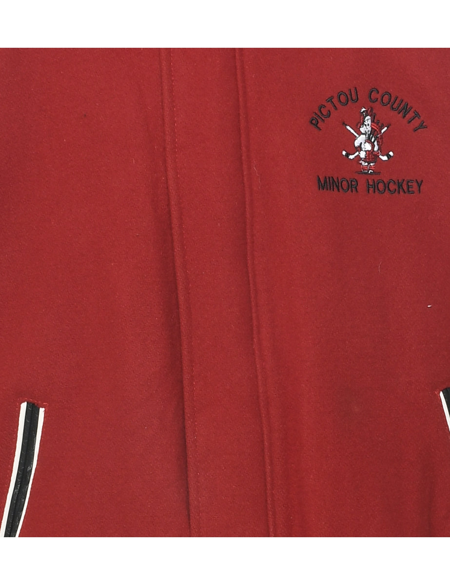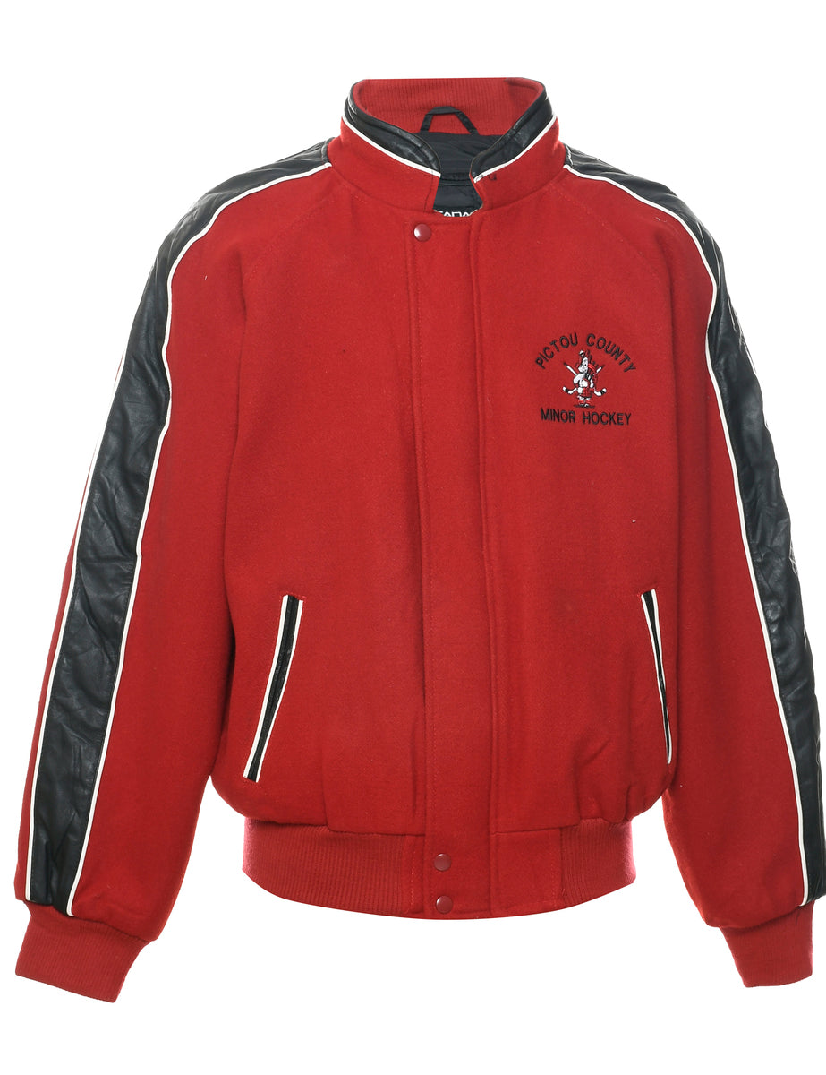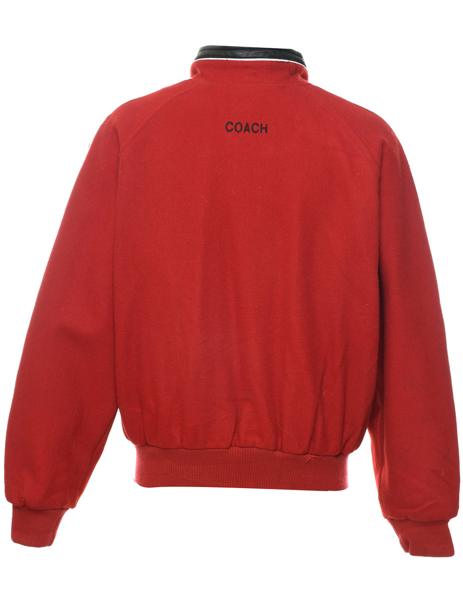 Zip front team jacket comes in red with multiple pockets and raglan sleeves.