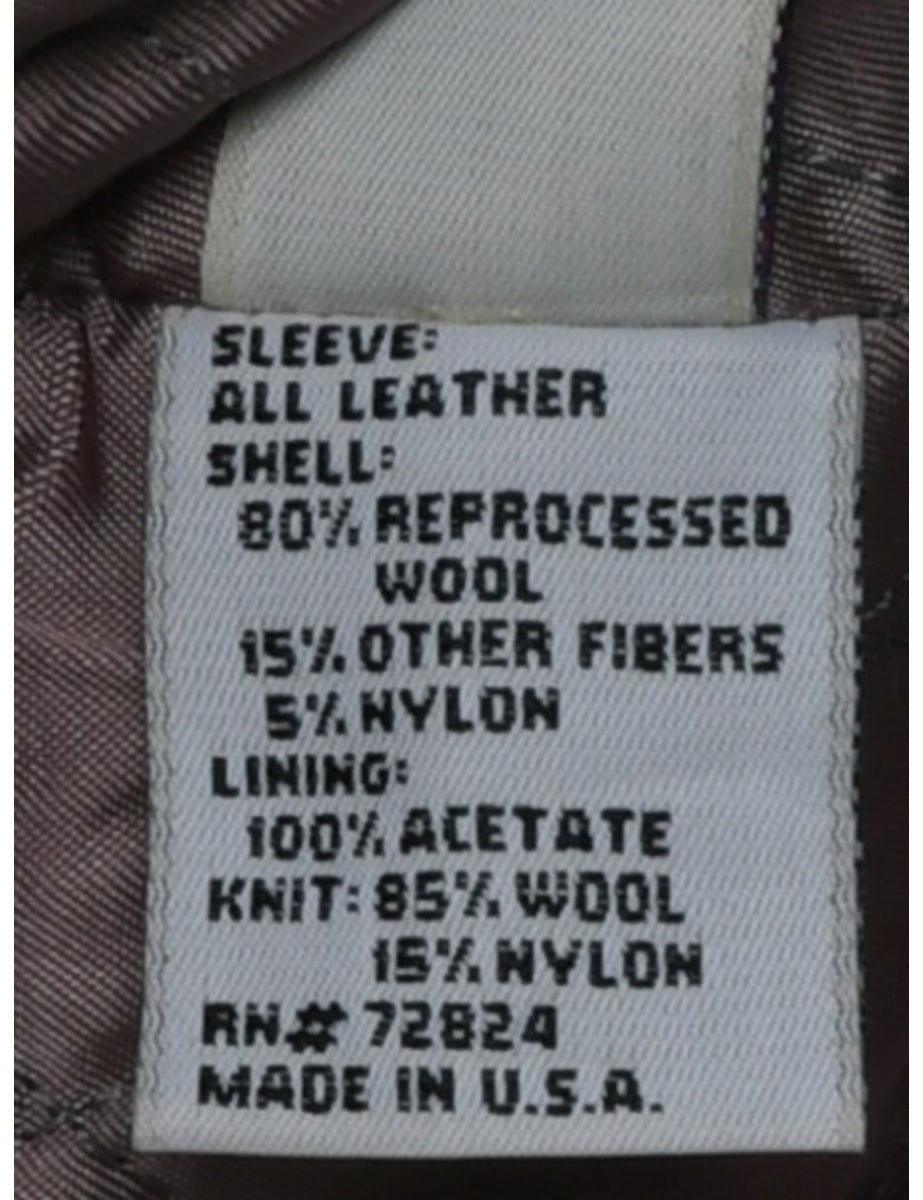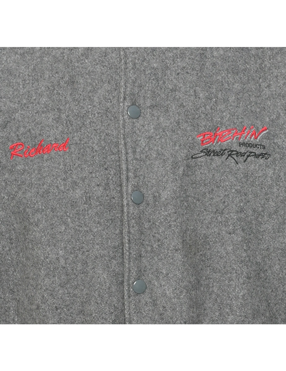 Two tone team jacket comes in grey & black with multiple pockets and leather sleeves.