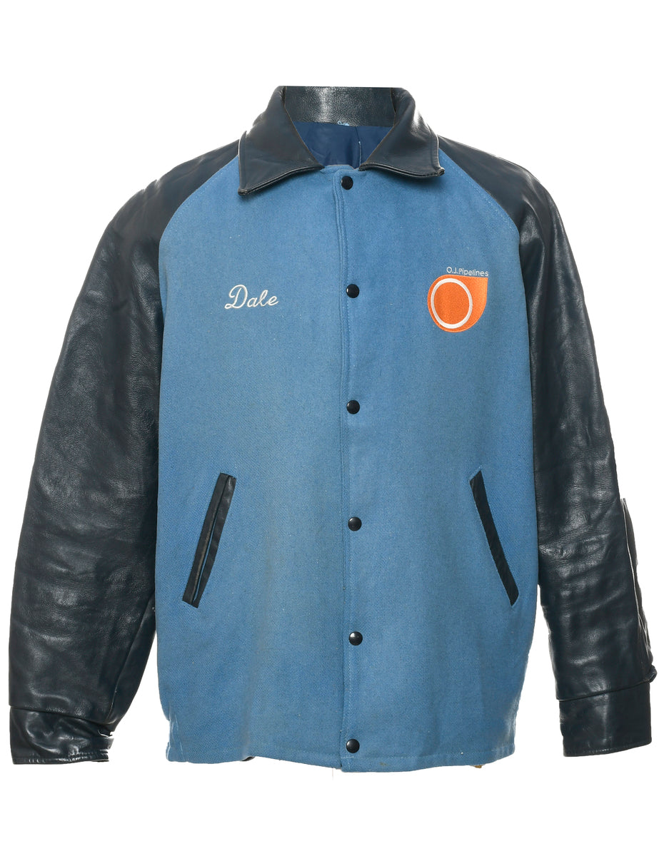 Two tone team jacket comes in blue & navy with multiple pockets and raglan sleeves.