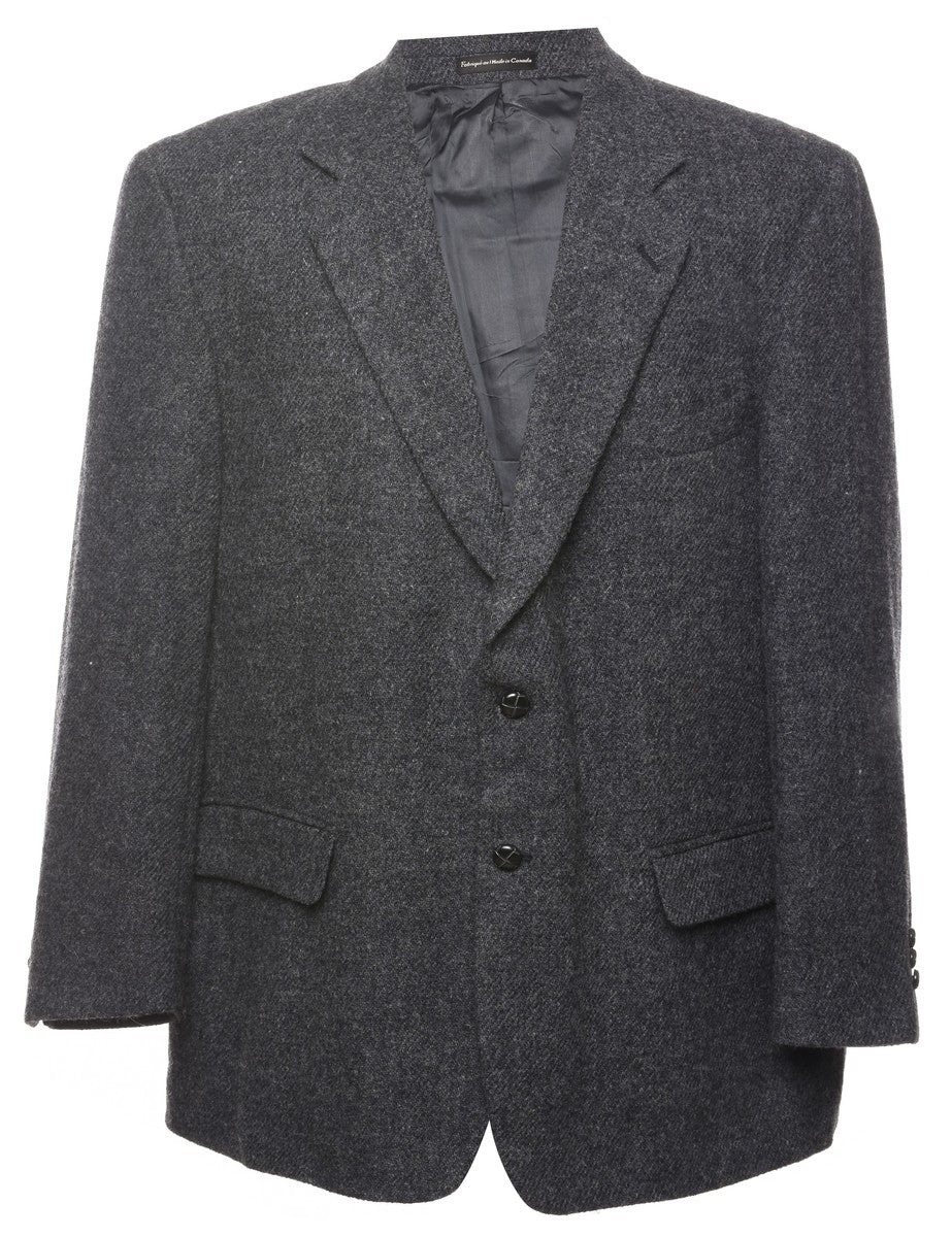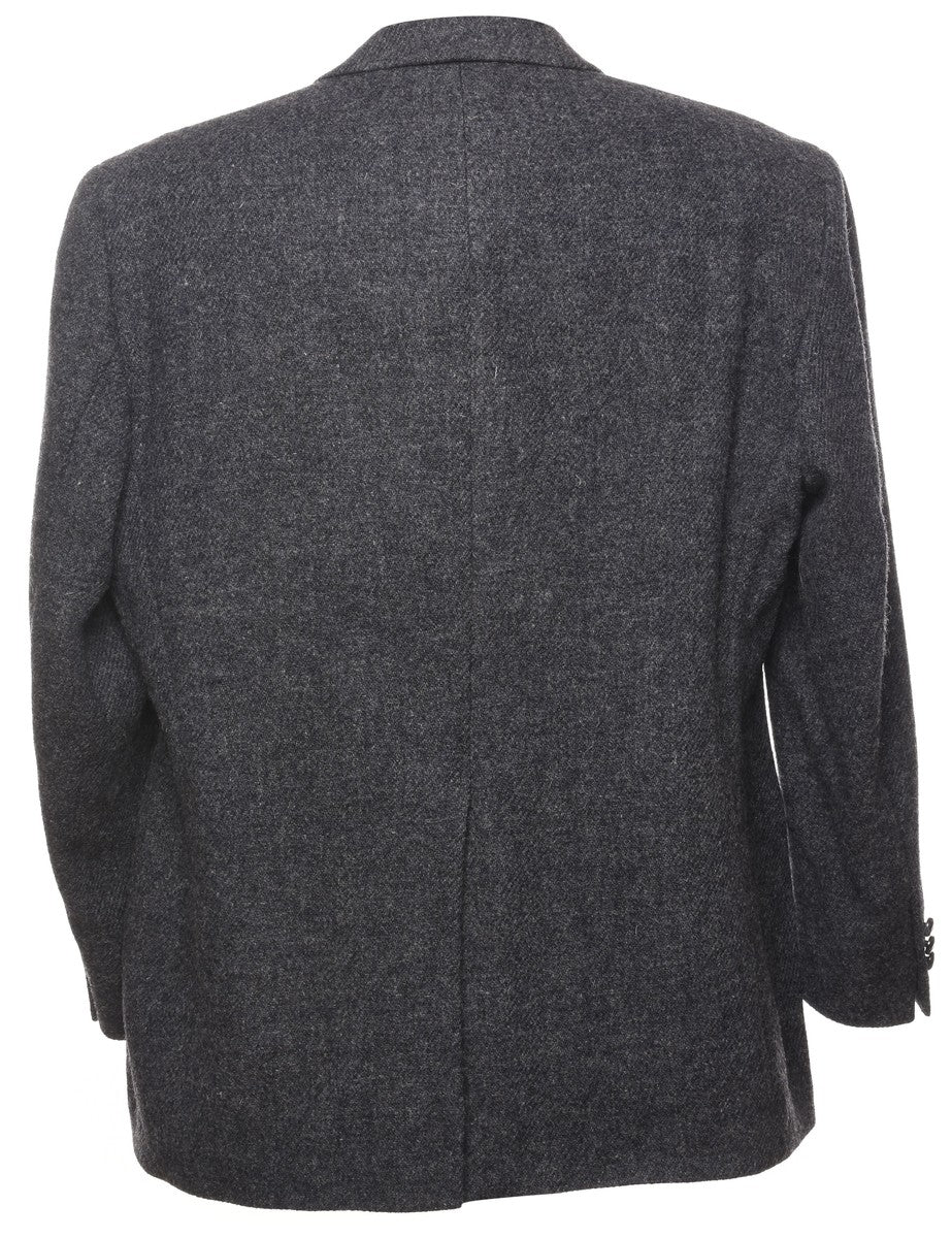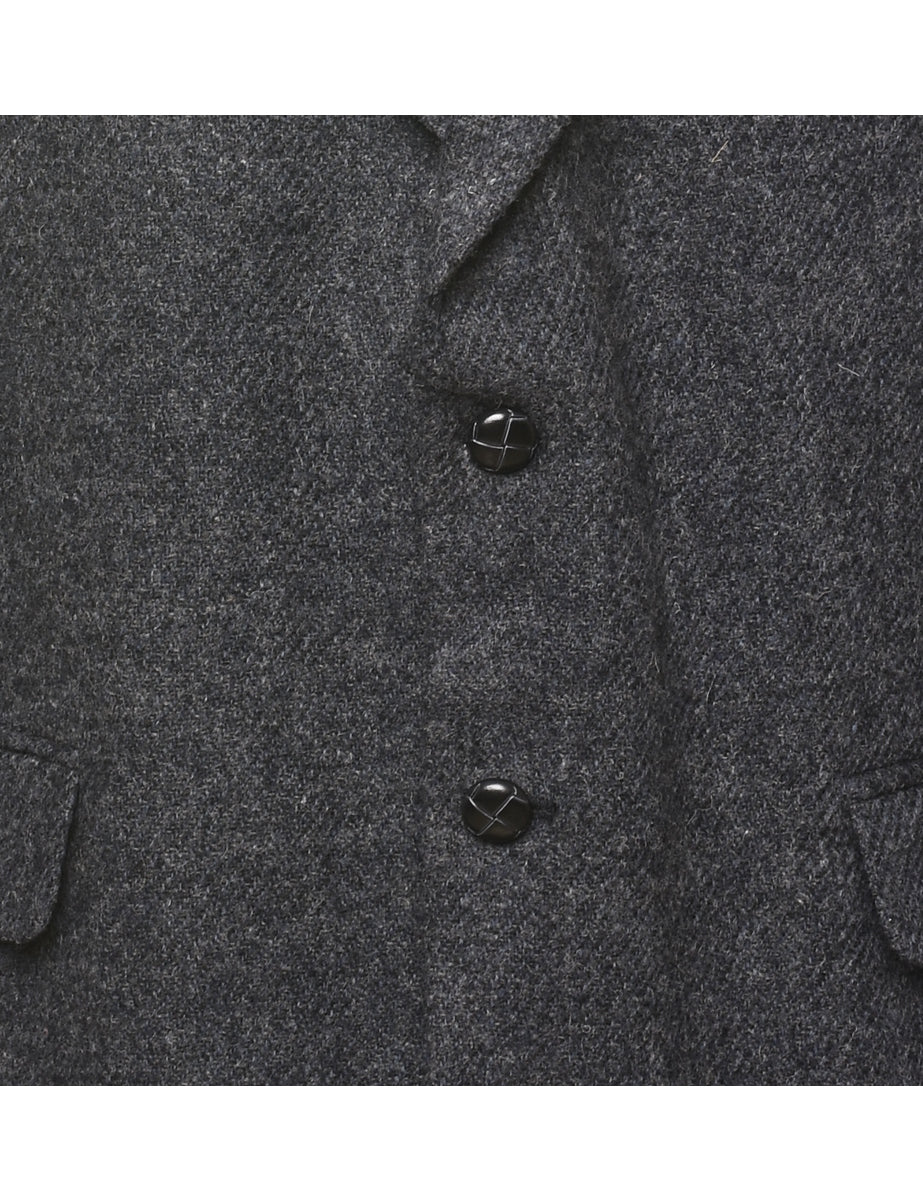 Button front blazer comes in dark grey with multiple pockets and shoulder pads.