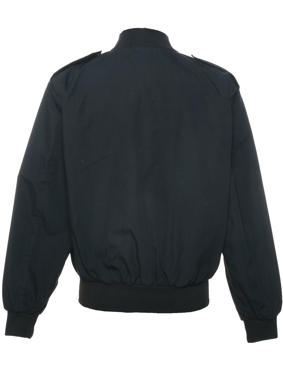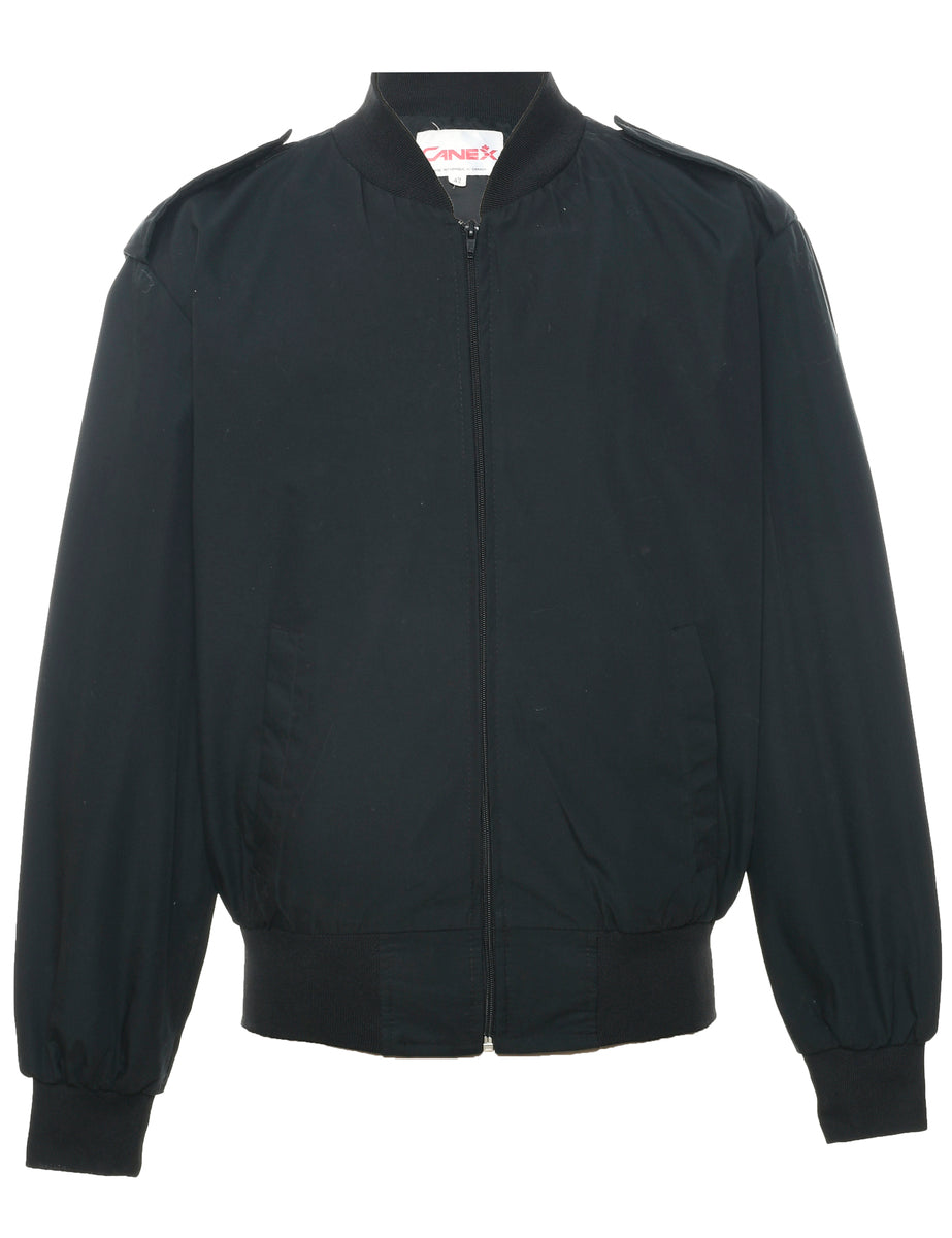 Zip front bomber jacket comes in black with epaulettes and multiple pockets.