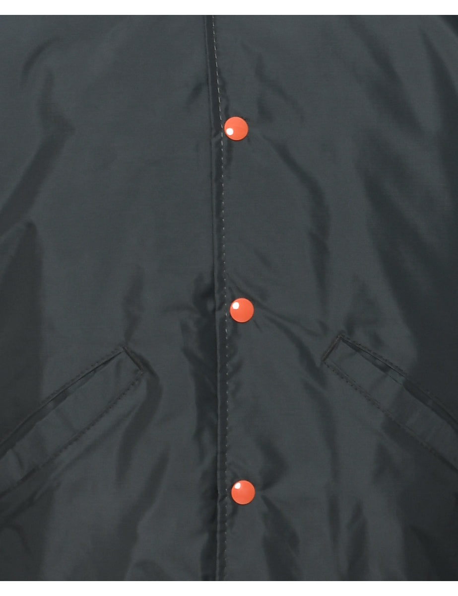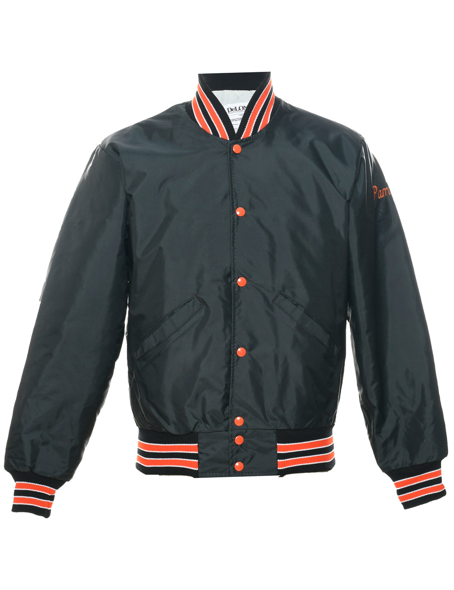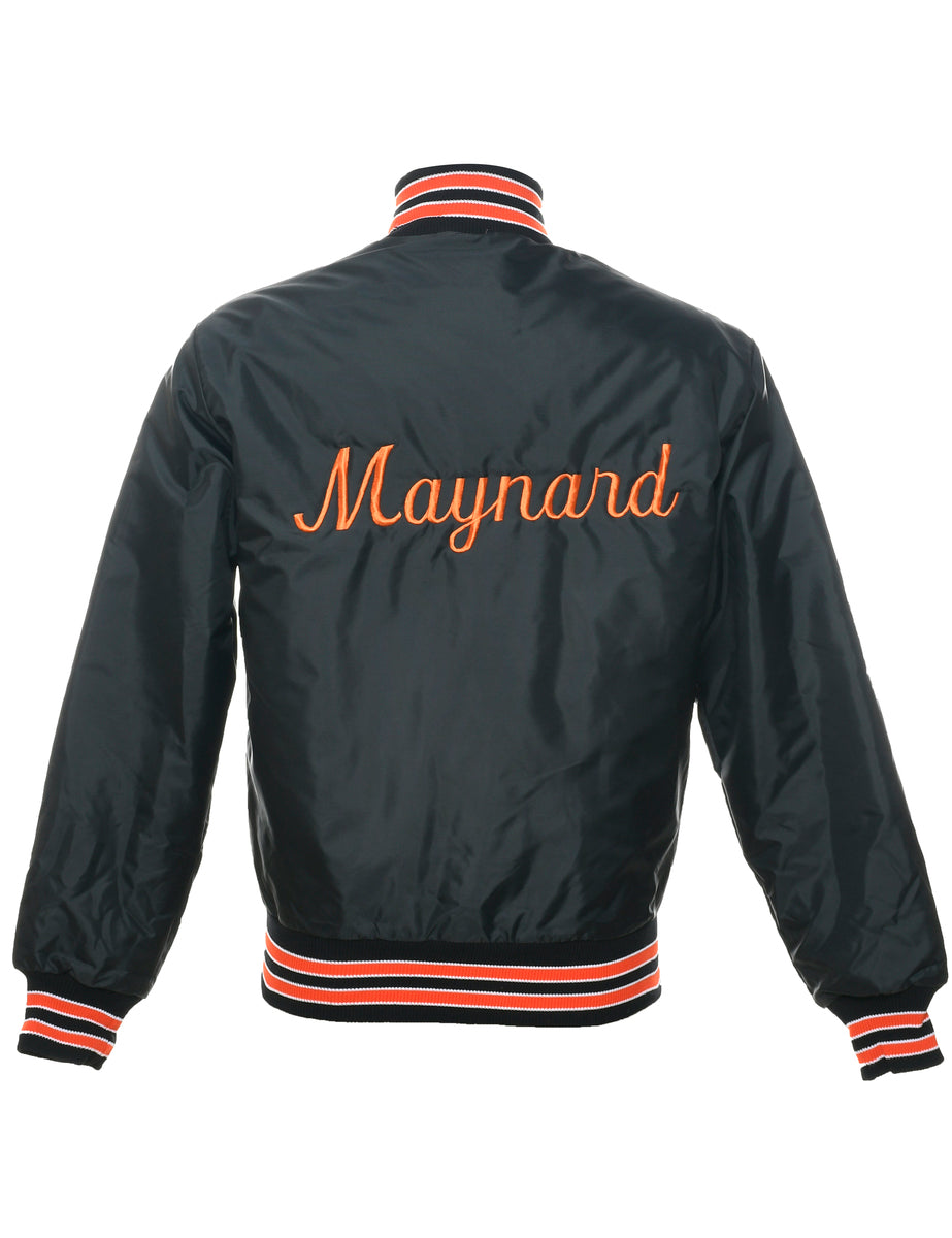 Bomber jacket comes in black with quilted lining and multiple pockets.