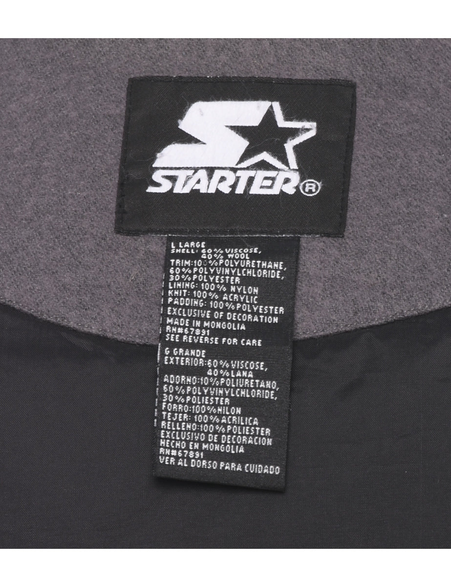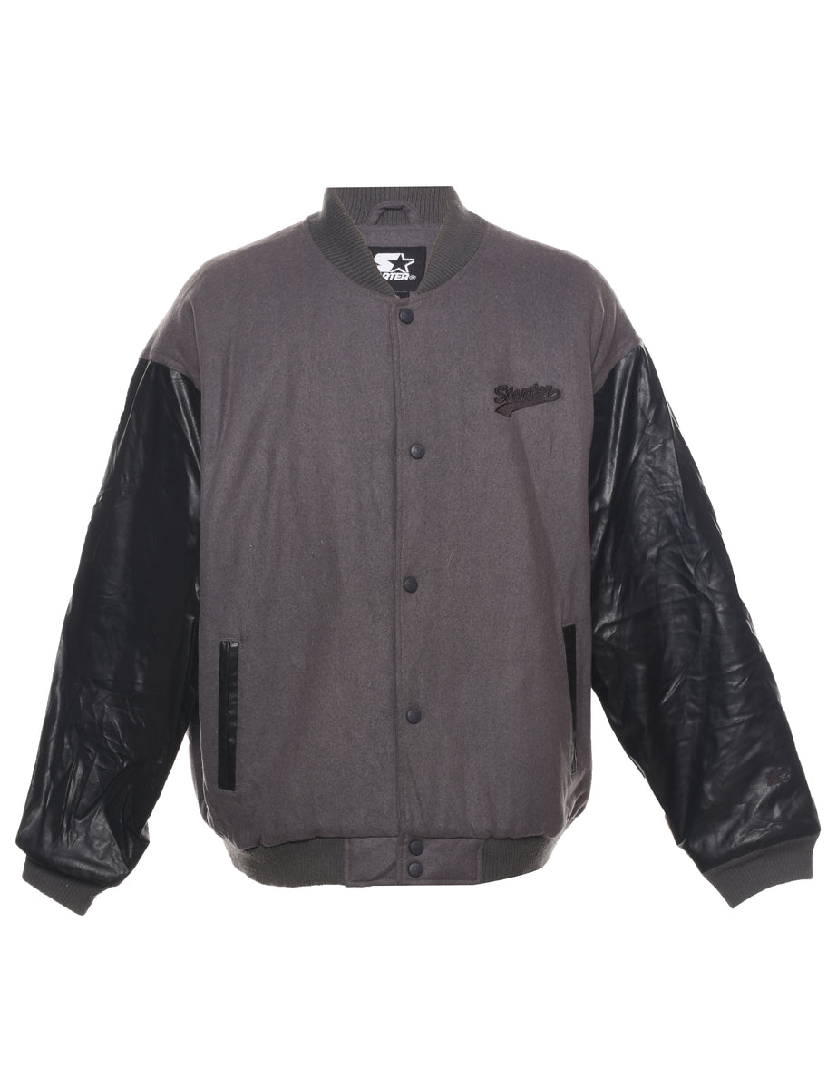 Grey Starter bomber jacket with multiple pockets and faux leather sleeves.