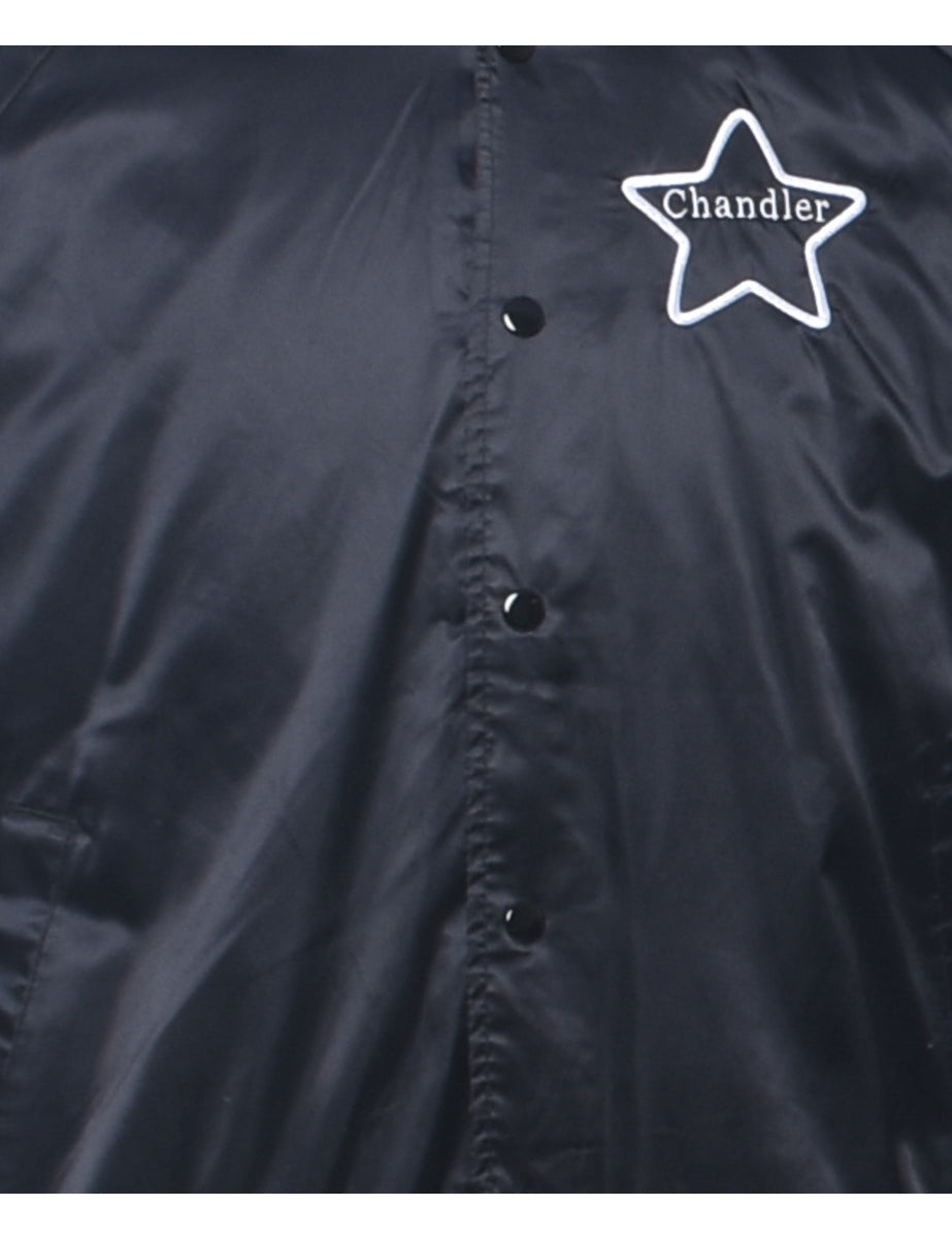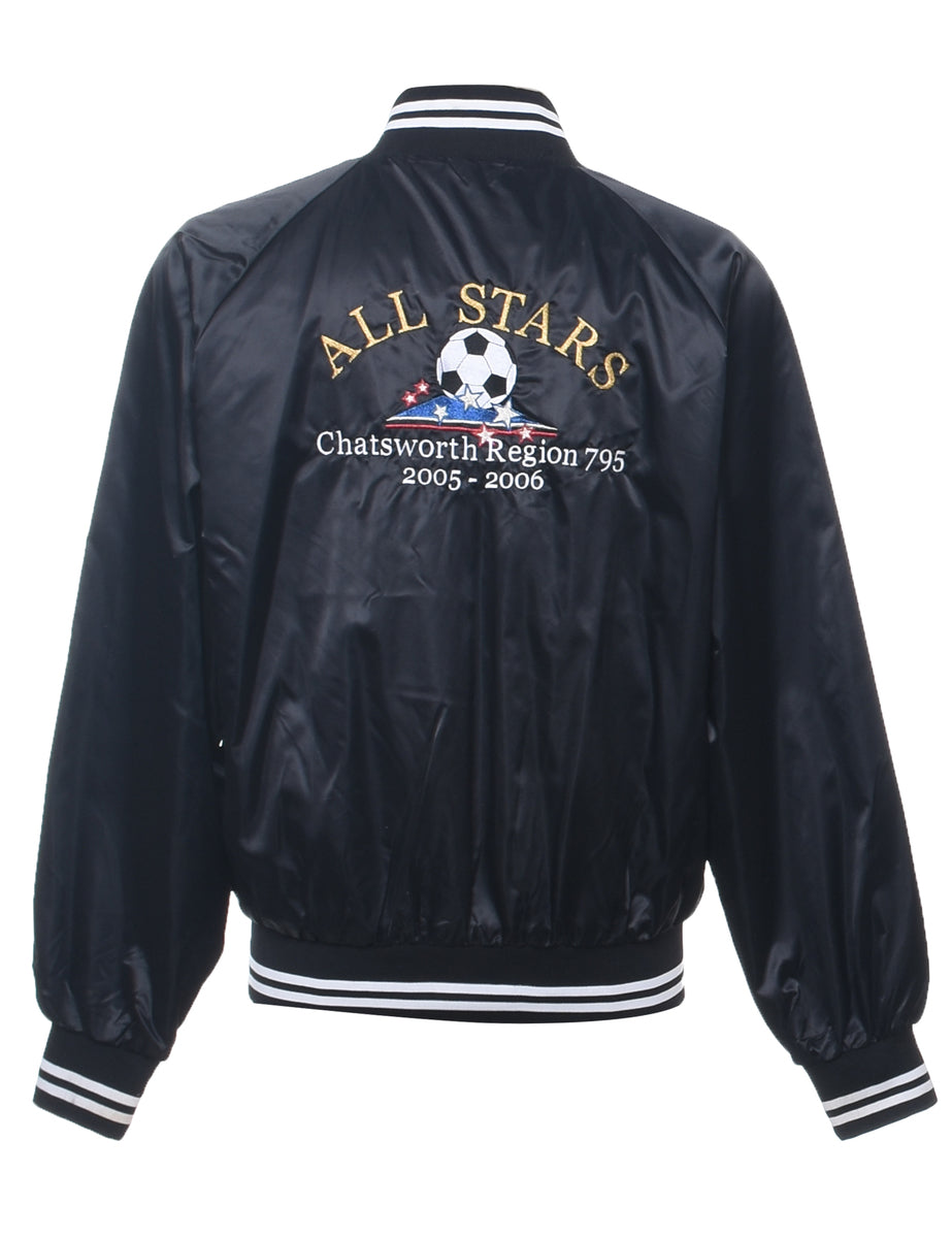 Bomber jacket comes in black with multiple pockets and raglan sleeves.