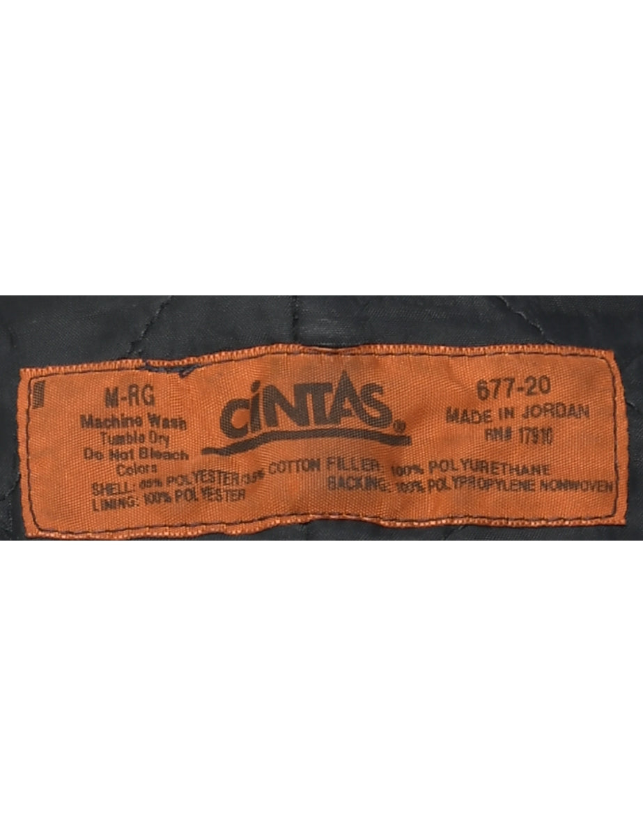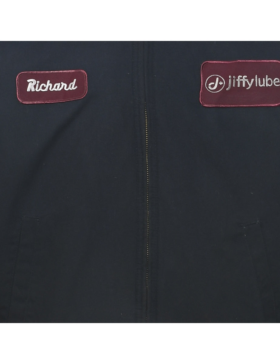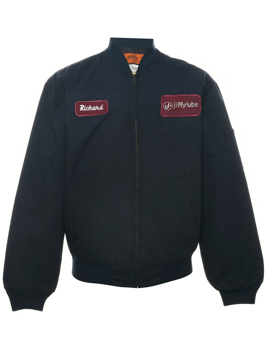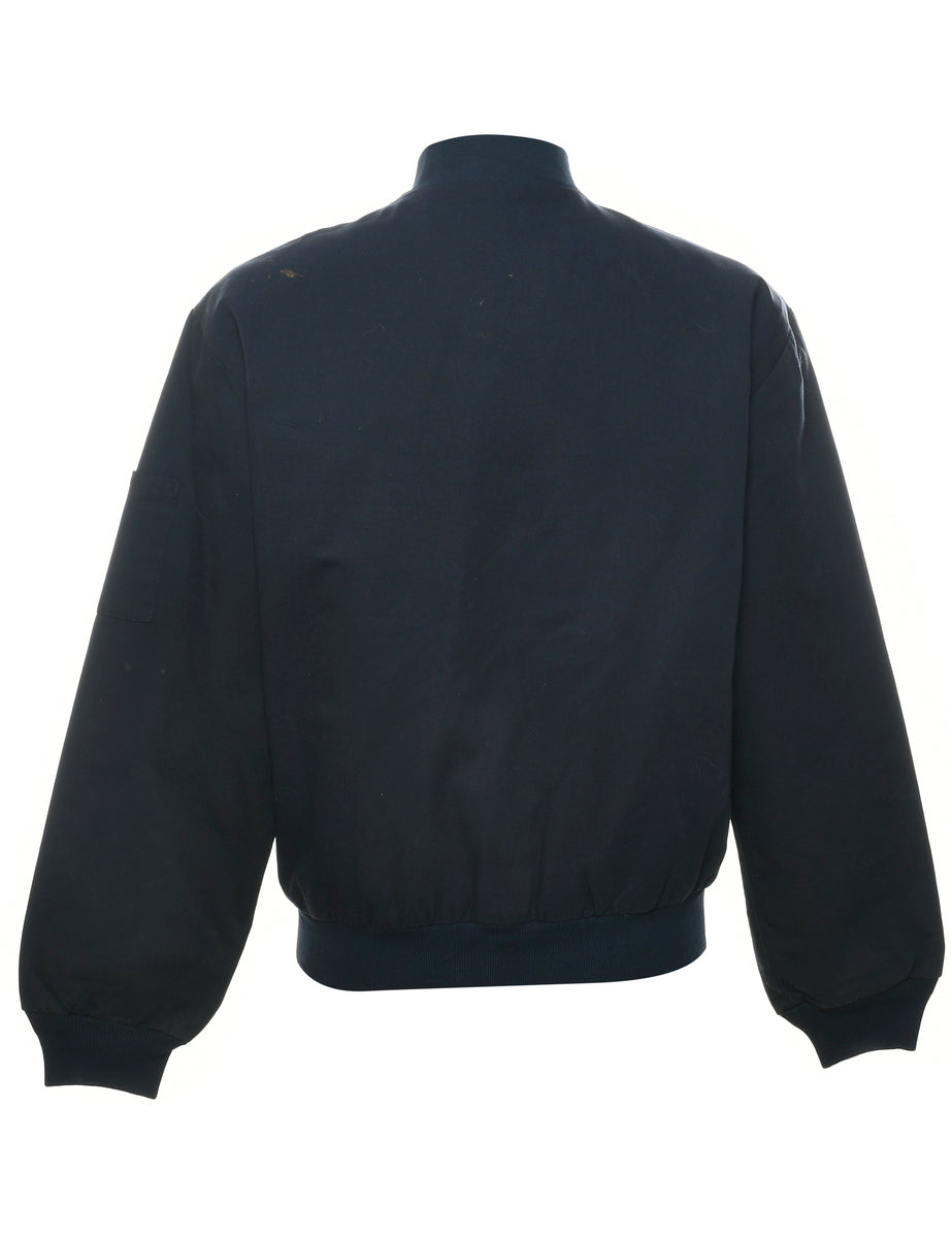 Workwear black bomber jacket with quilted lining and multiple pockets.