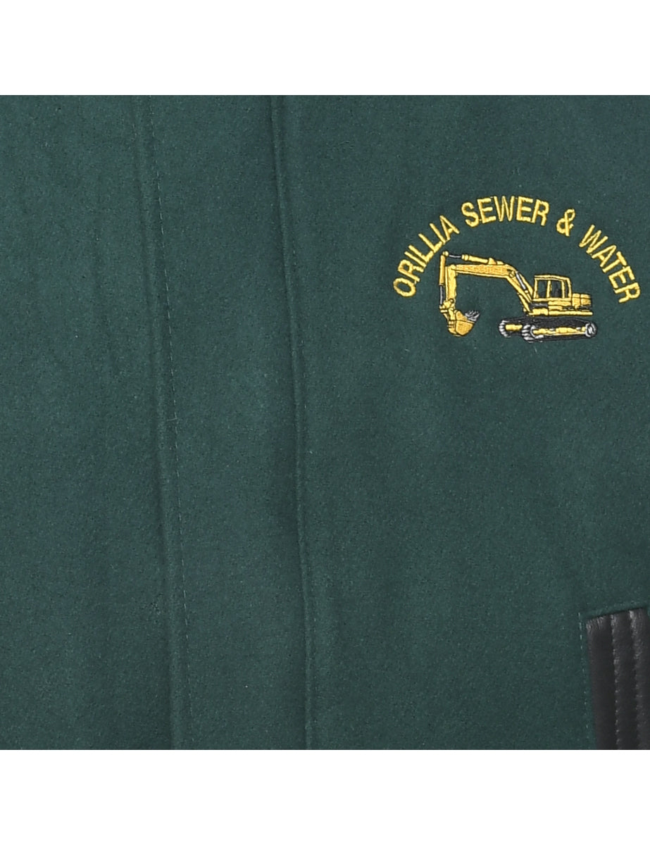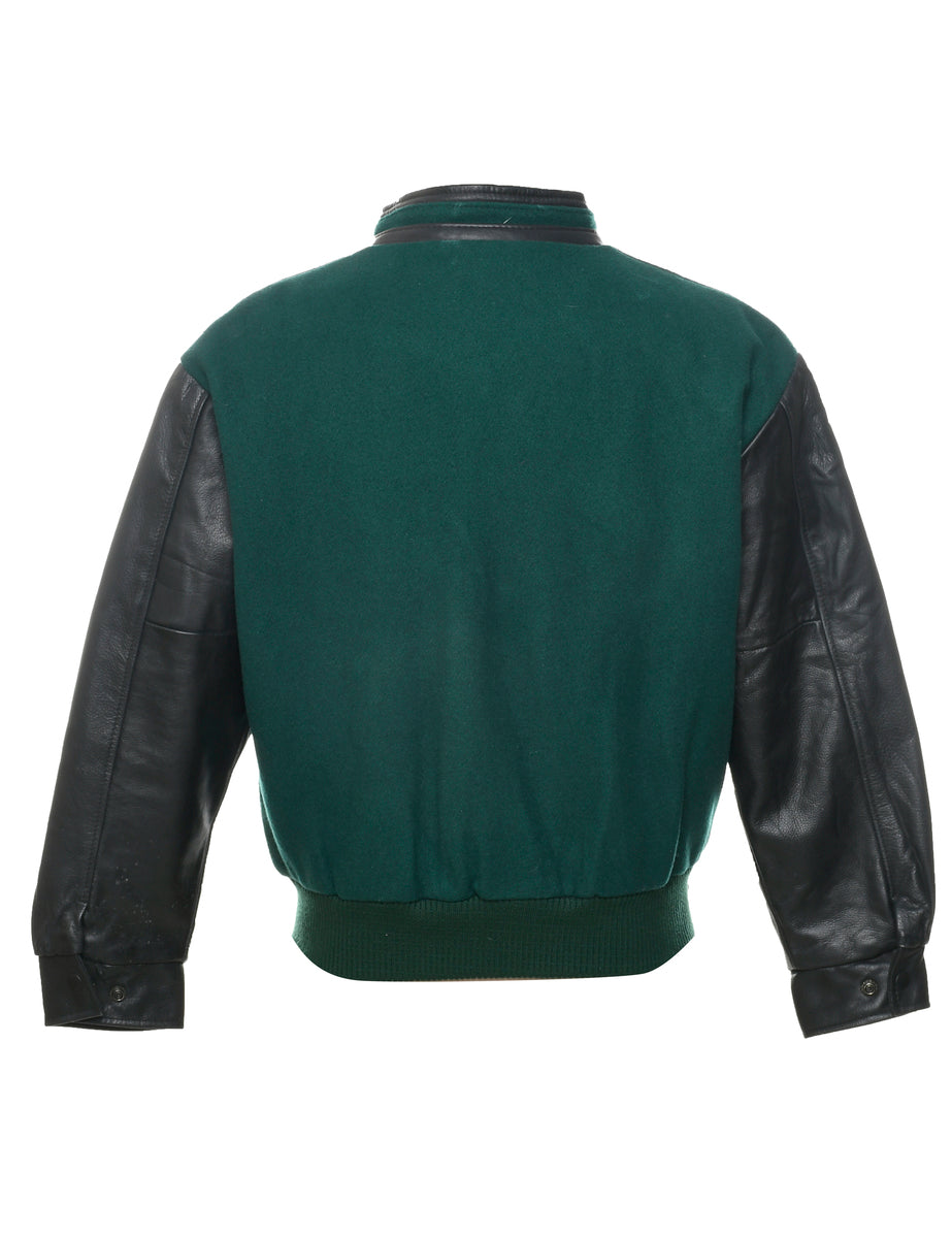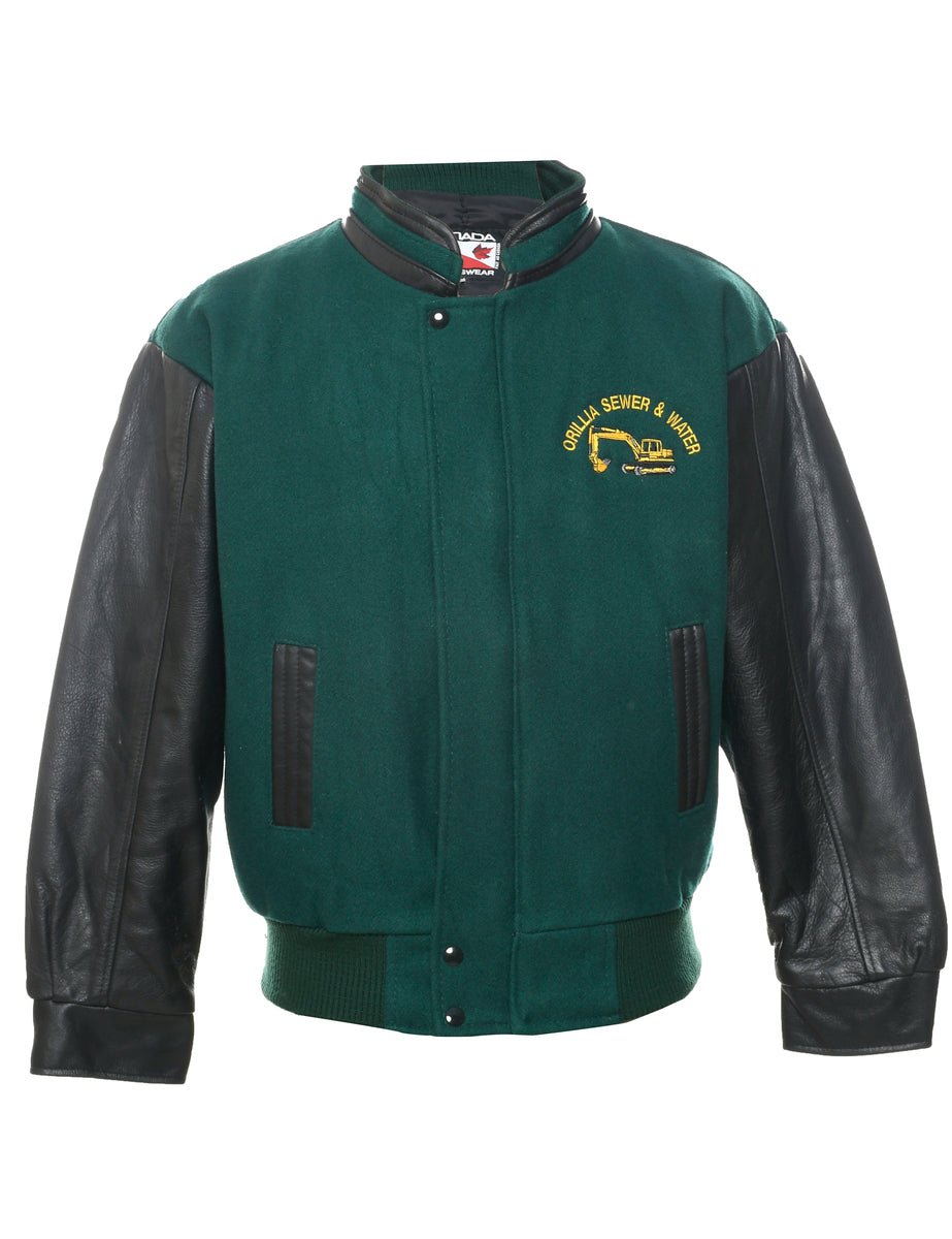 Team jacket in dark green & black with quilted lining and leather sleeves.The size label mentions S but based on the actual measurements we consider it a size M.