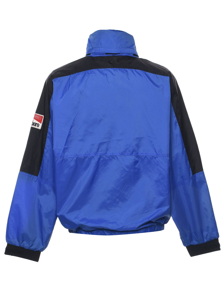 Zip front jacket in blue & black with multiple pockets and raglan sleeves.