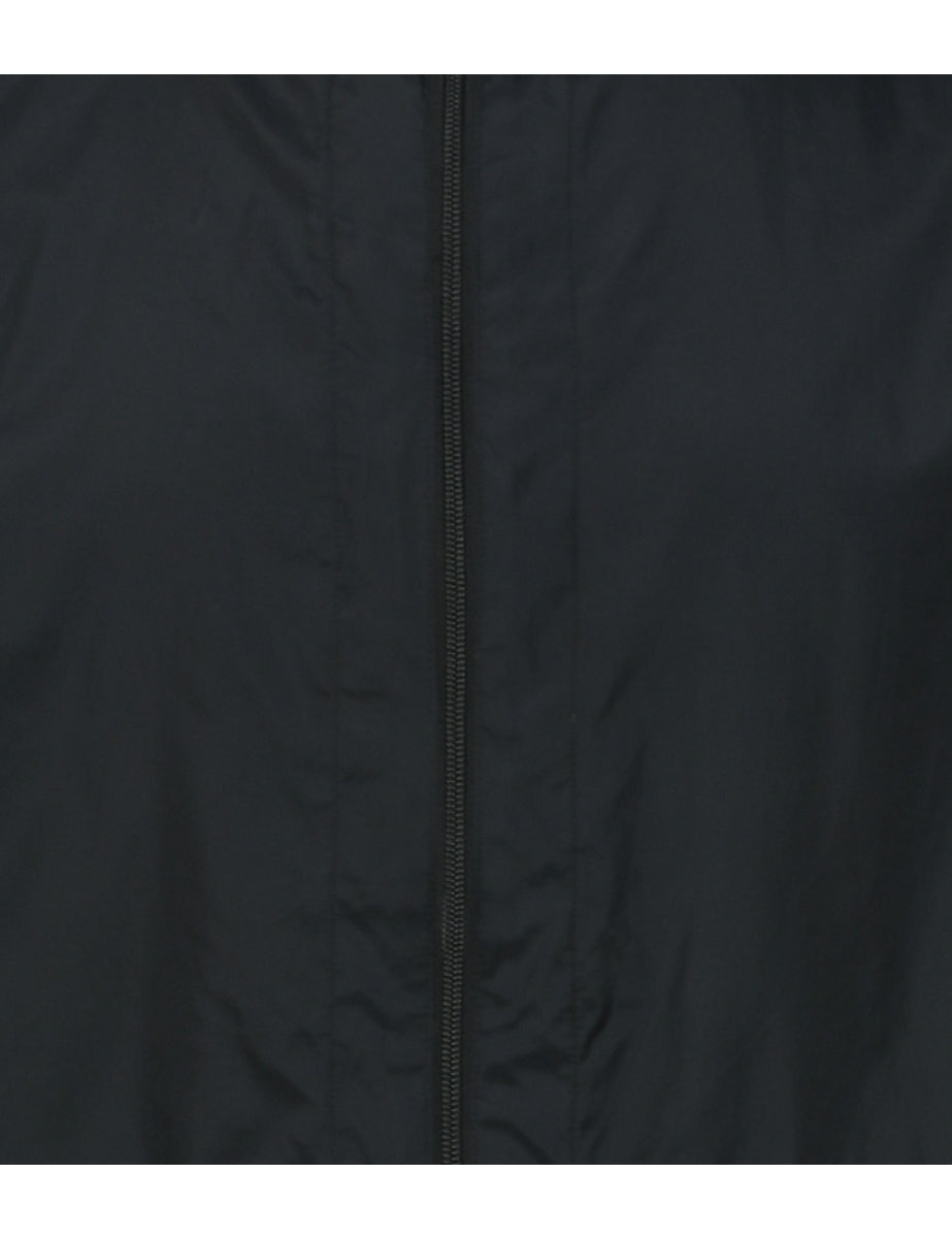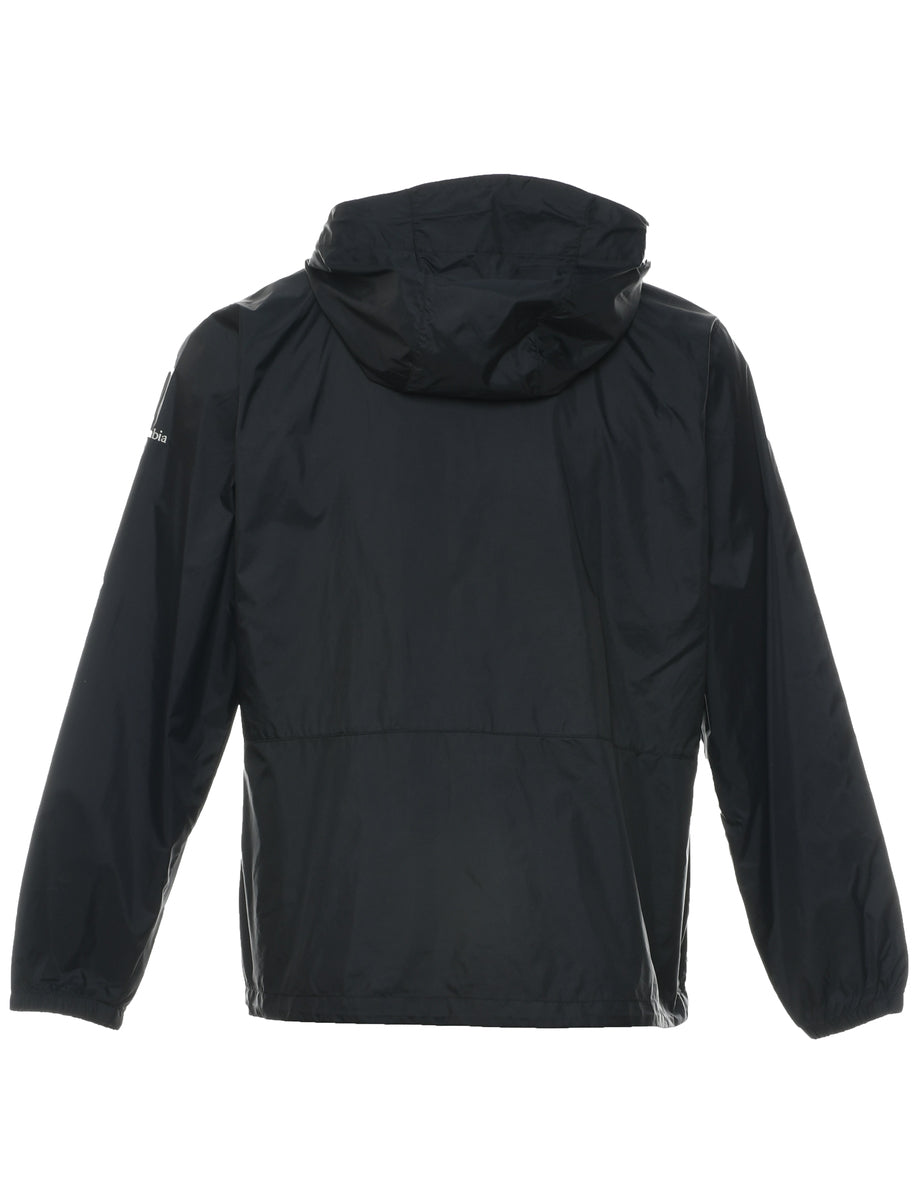 Zip front black Columbia nylon jacket with a hood and multiple pockets.