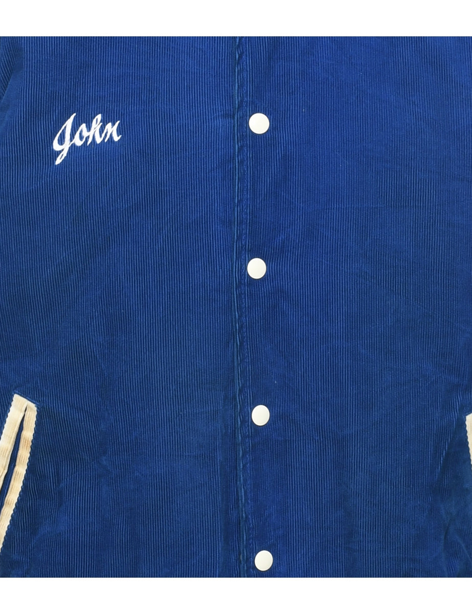 Corduroy team jacket comes in blue with quilted lining and multiple pockets.