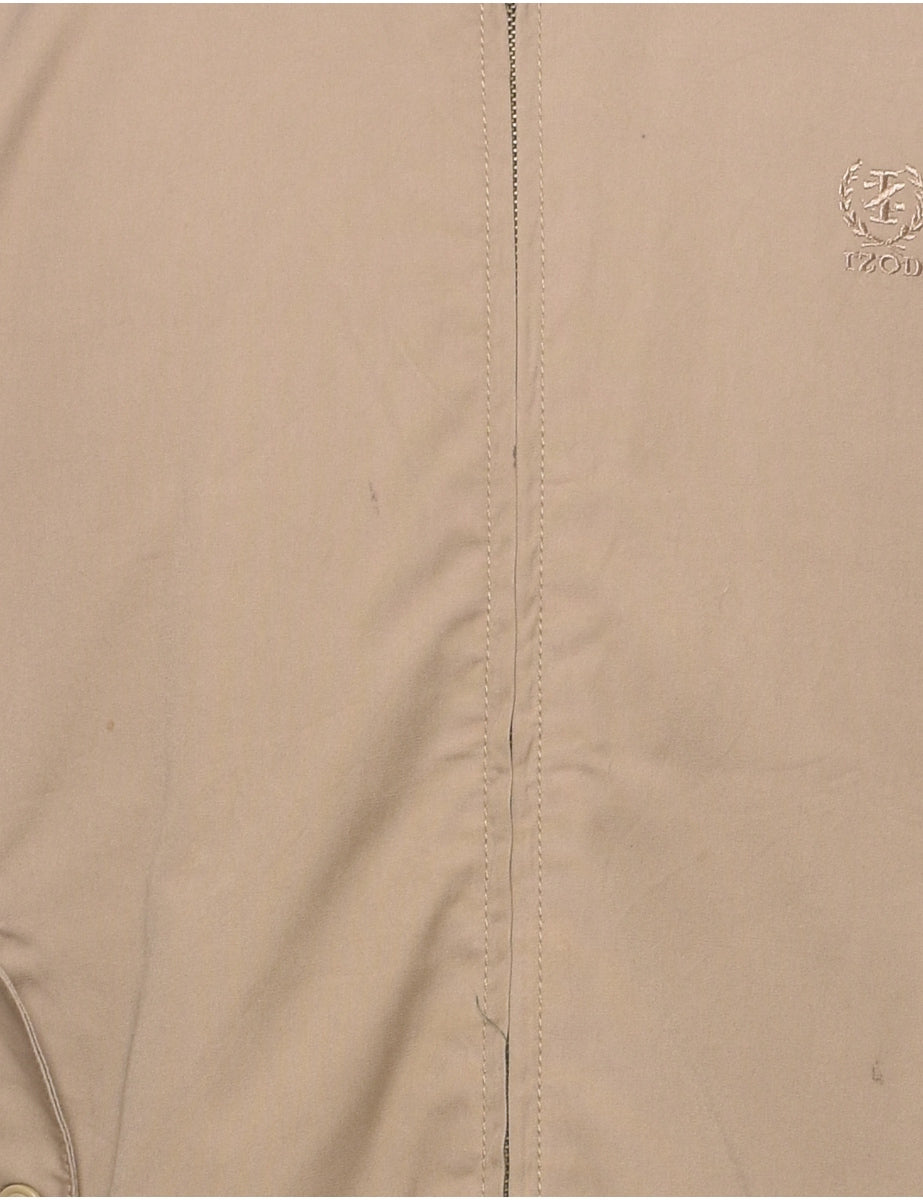 Izod zip front jacket in beige with multiple pockets and raglan sleeves.