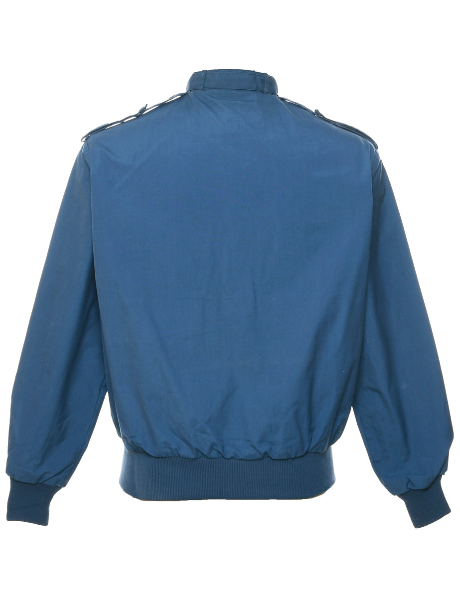Zip front navy harrington jacket with epaulettes and multiple pockets.